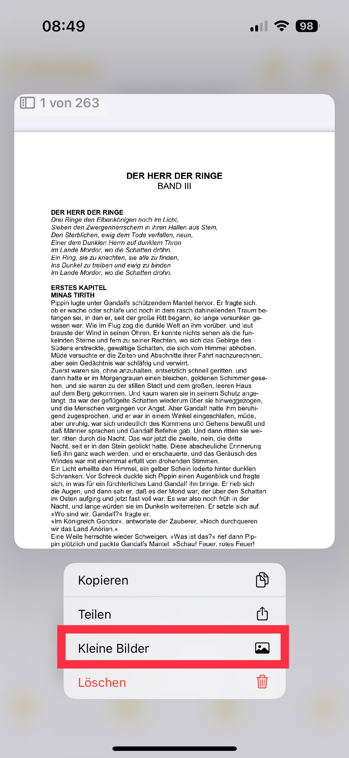 - Für eine bessere Übersicht, tippe eine PDF länger in der Notizen App und wähle dann "Kleine Bilder"