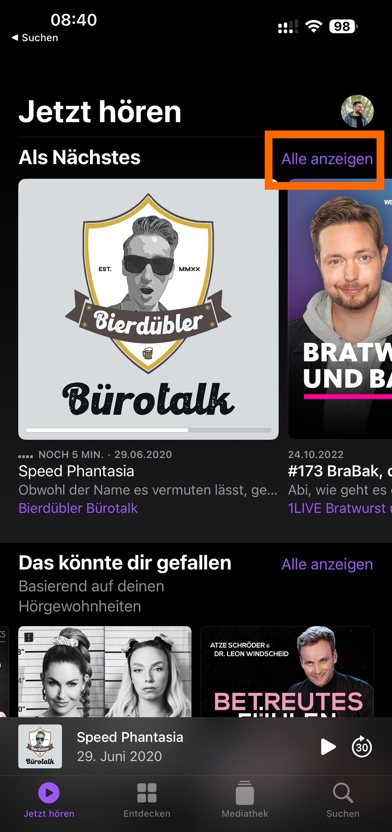 Wenn du die App öffnest, auf der "Jetzt hören" Seite, steht oben "Als Nächstes". Dort kann man Rechts auf "Alle anzeigen".