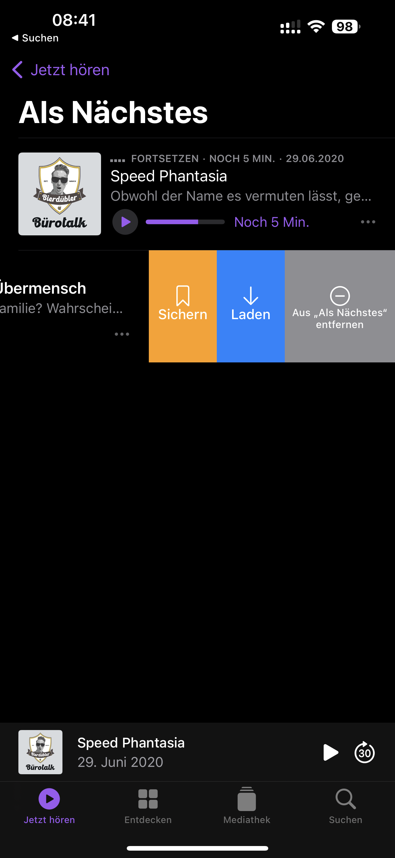 Löschen von Folgen aus der "Als nächstes wiedergeben"-Liste: Gehe zur "Als nächstes wiedergeben"-Liste, finde die Episode, die du entfernen möchtest, und wische sie nach links. Es sollte eine hell graue "Entfernen"-Option erscheinen, die du auswählen kannst, um die Episode aus der Liste zu entfernen.