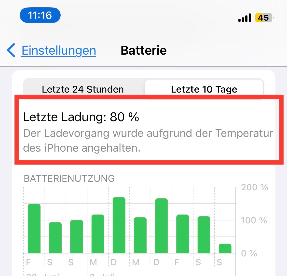 Ich habe letzten Monat ein gebrauchtes iPhone 12 Pro gekauft mit einer Akkukapazität von 100% (Akku wurde im Oktober 2022 getauscht). Mittlerweile (nach nicht einmal 4 Wochen) liegt die Akkukapazität schon bei 96%.