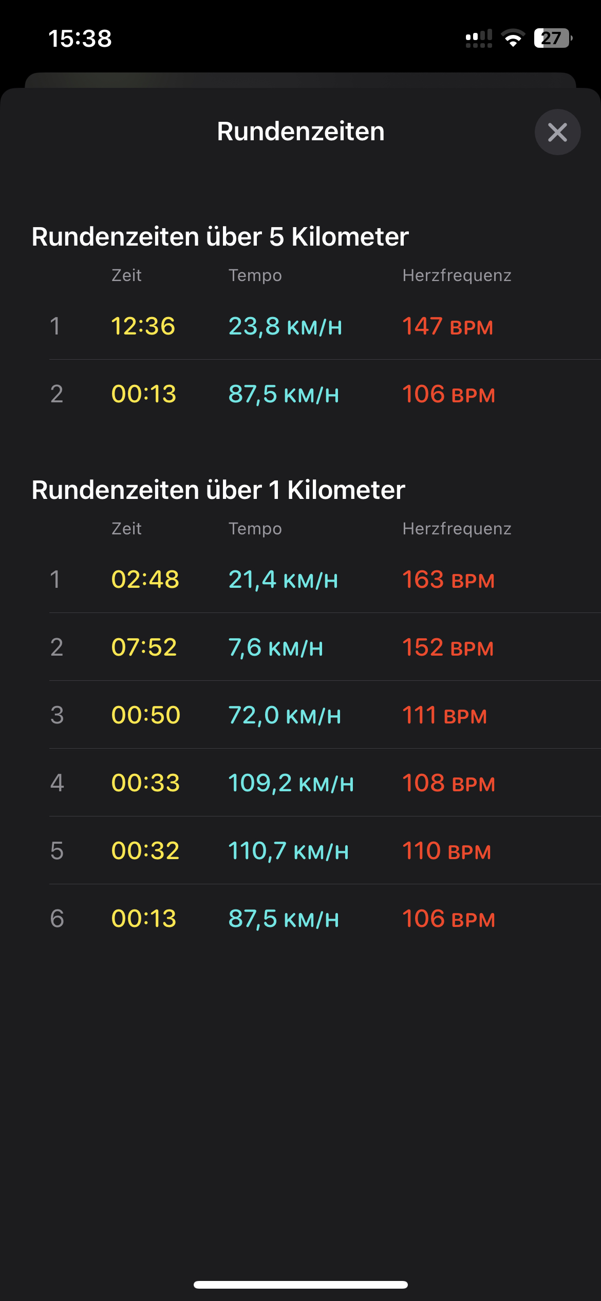Kann mir jemand helfen wie das in der Fitness App richtig angezeigt wird? Denn ansonsten stimmt die km Anzahl nicht. Wie im Bild unten zu sehen sind nur die ersten beiden Runden echt, die letzten vier würde ich gerne löschen.