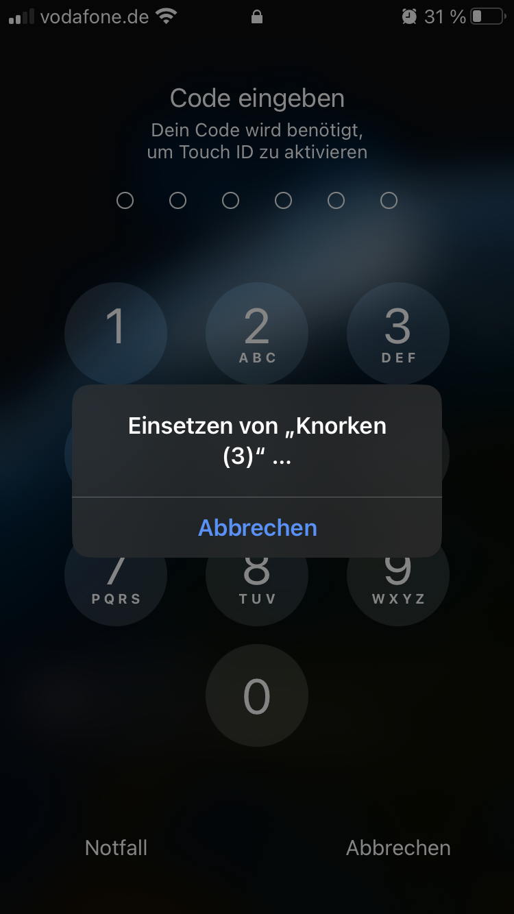 Ich hatte am iPad einen Text kopiert. Danach erschien am iPhone über einer App, welche ich gerade offen hatte, Einsetzen von iPad mit dem Button Abbrechen. Ich habe Abbrechen betätigt, aber die Einblendung verschwand nicht. Nachdem ich das Handy gesperrt habe, war die Einblendung selbst im Sperrbildschirm zu sehen und alles was darunter ist, kann man nicht mehr nutzen. Touch ID funktioniert nicht, Code eingeben auch nicht. Erzwungenes ausschalten auch nicht, da ich damit einen Notruf auslöse. Auf dem iPhoneSE2 ist das aktuelle iOS drauf(Stand 17.05.2023) und das iPad hat 16.4.1(a).