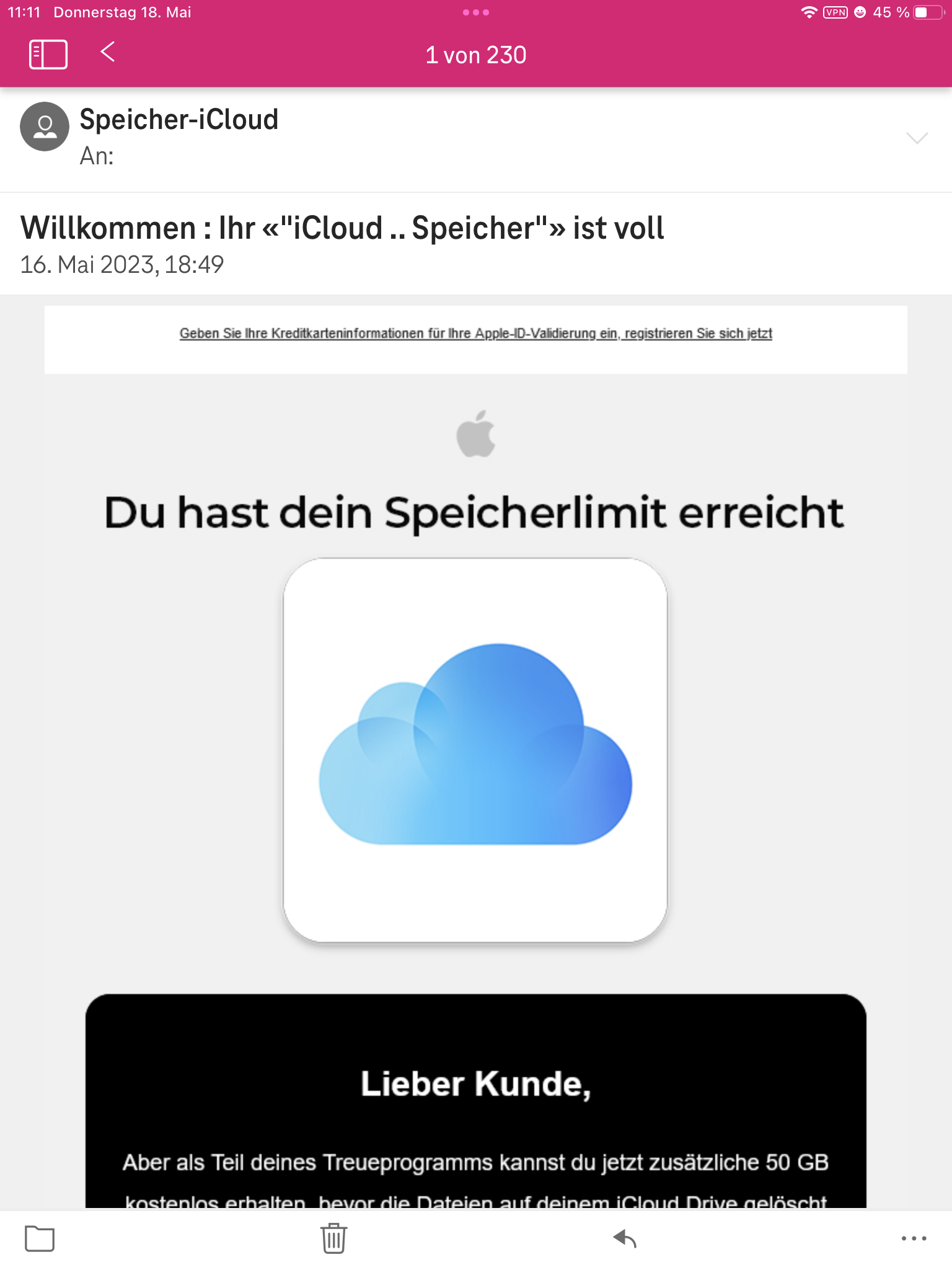 Phishing E-Mail über vollen iCloud Speicher erhalten