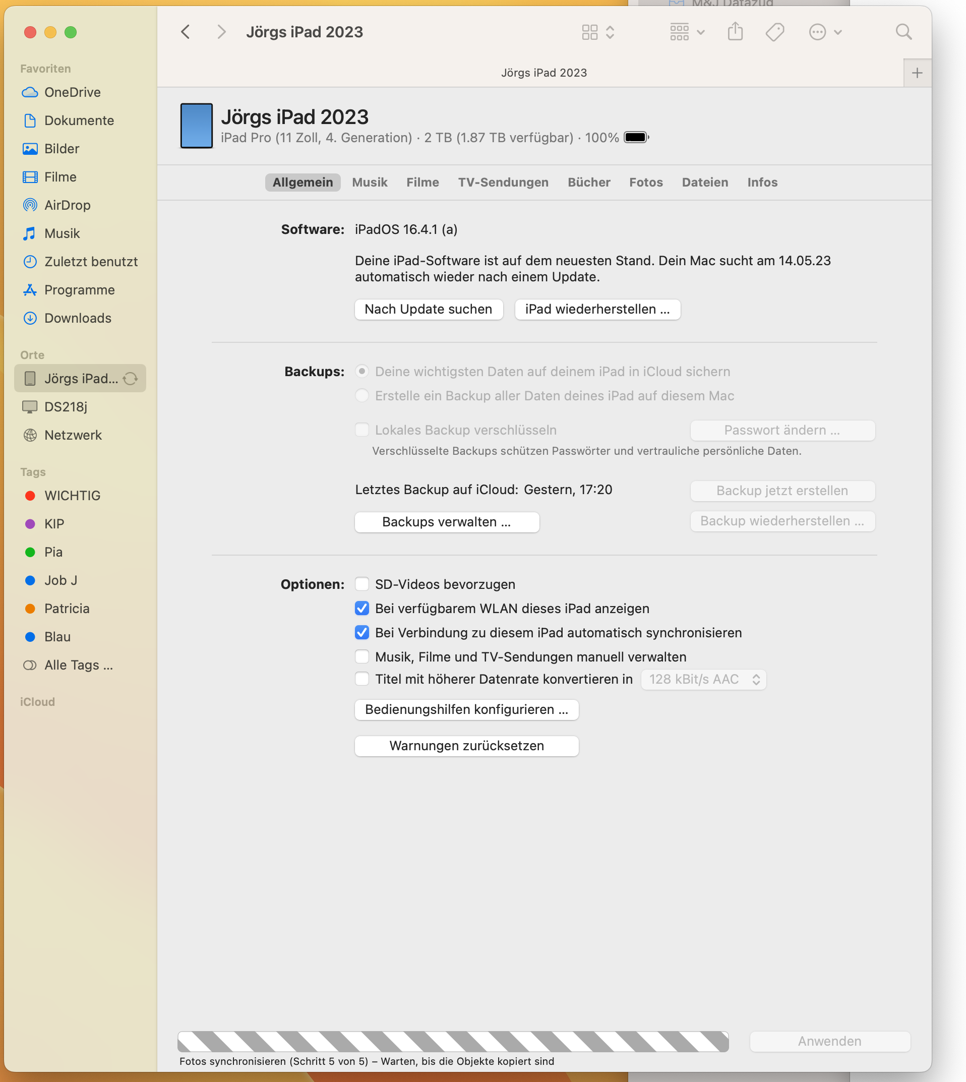 ich habe ein neues MacMini und ein neues iPad Pro. Leider funktioniert die Synchronisation meiner Fotos Mediathek (ca 500 GB, 50'000 Bilder und Filmchen) vom MacMini auf das iPad nicht. D.h. die Synchronisation (mittels Kabel) beginnt normal, im Balken unten im Synchronisationsfenster der Finder zählt der Balken die kopierten Bilder hoch. Anschliessend zeigt der Balken nur noch ein sich bewegendes Zebramuster (vgl. Beilage) die dann auf ewig weiter läuft (hab es mal über 4 Tage laufen lassen). Nach Abbruch sind immer noch keine Bilder auf dem iPad.