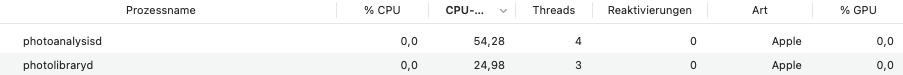 - Die Endlosschleife des Kuratierens: Das ist ein Hintergrundprzoess der immer läuft, solange dein Mac am Strom angeschlossen ist und du gerade Fotos nicht benutzt. Fotos geht deine Bilder durch, um ein ansprechendes Layout der Fotos erstellen zu können. Das betrifft nur die gekachelte Anordnung der Fotos in der Ansicht Tage oder in den Rückblicken. Fotos versucht eine Auswahl der Fotos zu finden (ohne Duplikate oder ähnliche Fotos, und sie so zu beschneiden, dass diese Nahtlos gekachelt werden können. Es ist nicht wichtig, ob Fotos damit schon fertig ist. Wir können Fotos auch schon gut benutzen, bevor dieses abgeschlossen ist. es wird sehr lange dauern. Bei meiner Mediathek mit 50000 Fotos ware erst nach drei Monaten zum ersten Mal fertig. Und fing dann sofort wieder an, als ich neue Fotos importiert hatte. Damit Fotos kuratieren kann, darf er Mac nicht im stromsparmodus sein, falls es ein tragbarer Mac ist. Öffne einfach ein anders Programm und arbeite damit. Du brauchst Fotos nicht zu beenden. Lasse den Mac über nacht laufen.
