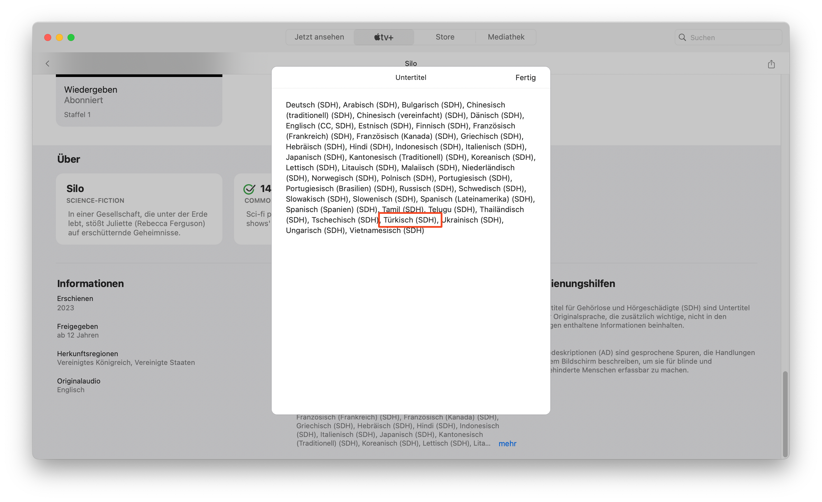 ich benötige bei Apple TV+ Untertitel in der Türkischen Sprache.