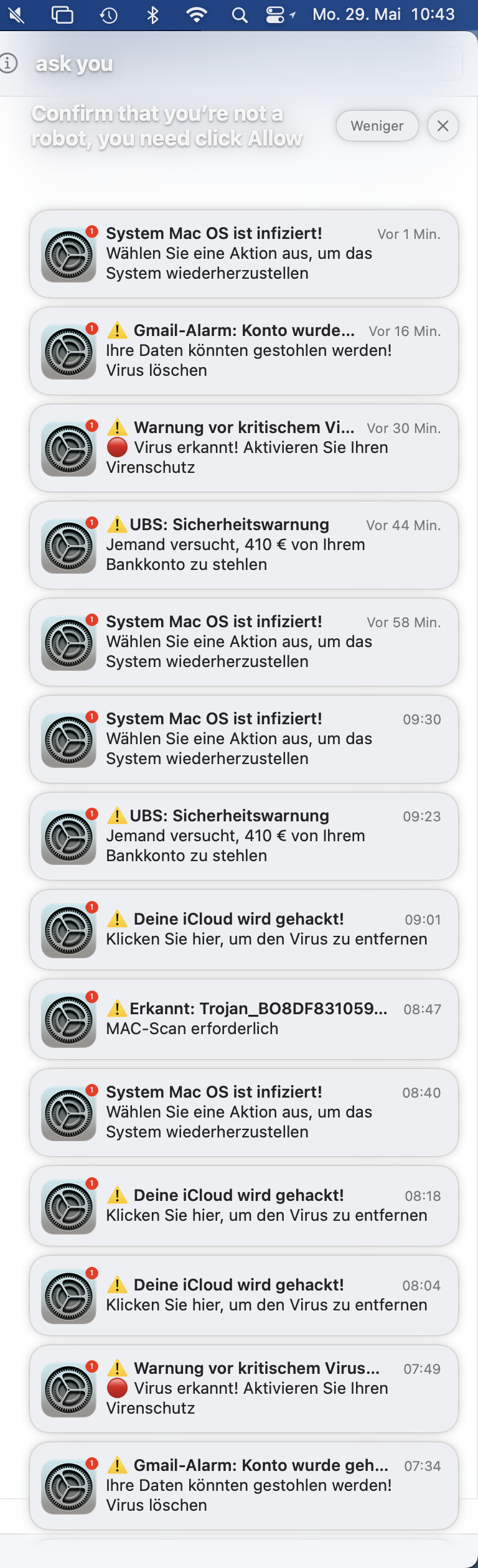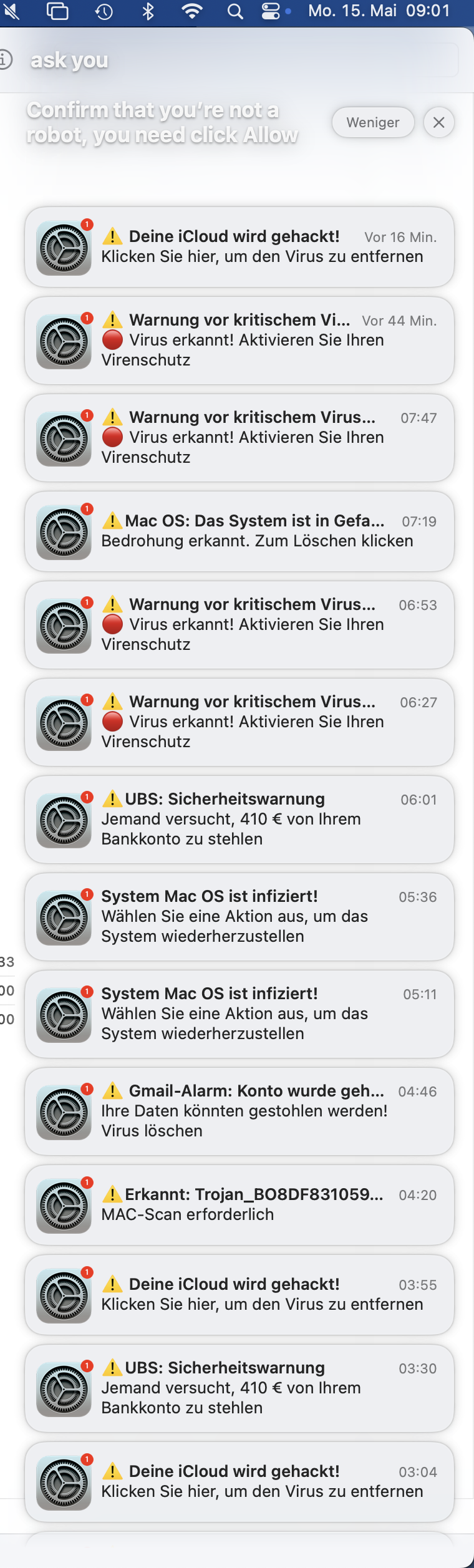 Seit einigen Wochen erscheint auf meinem iMac24 (macOS Ventura 13.4, also neueste Betriebssystemversion) etwa alle 15 min eine Nachricht, die wie eine Systemmeldung aussieht. Beispiele (Snapshots) siehe unten.