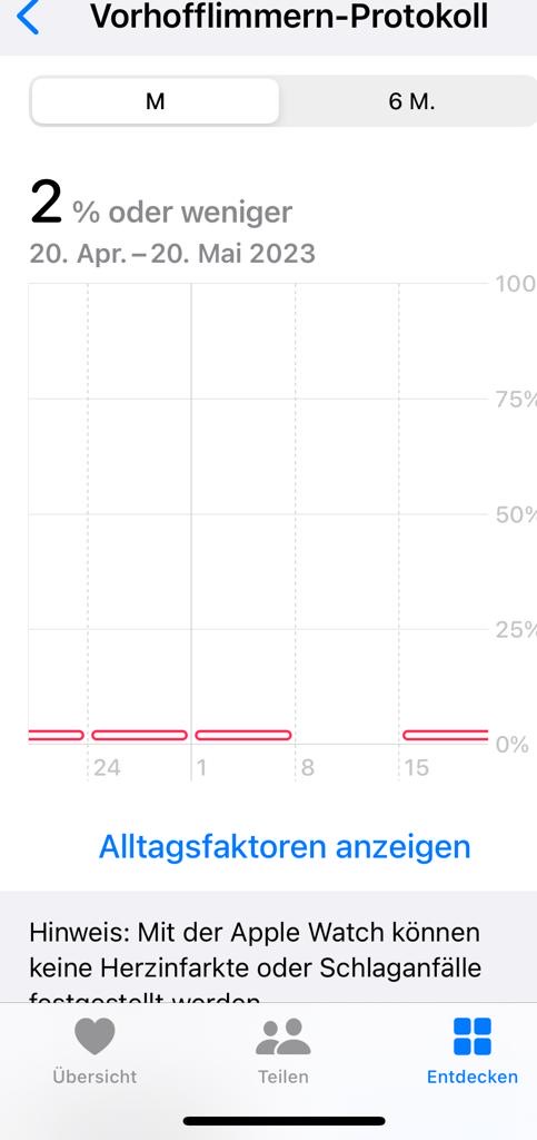 vielen Dank für Deine Bemühungen. Beim Vorhofflimmernprotokoll sollte zumindest die Anzeige 0-2% immer kommen. Das nichts angezeigt wird bzw. Lücke sind wie unten sollte nicht vorkommen wenn die watch an mindestens 5 Tagen für je 12 Stunden getragen wird.
