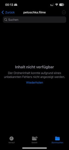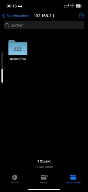 Ich habe an meinen Speedport Smart (erste Generation) eine 500 GB SSD via USB angeschlossen und über den Router als Netzwerkspeicher via smb freigegeben. Das funktioniert soweit einwandfrei, die Platte wird an meinem MacPro 1,1 mit OSX 10.7.5 gefunden, ebenso an meinem Lumia 930 mit Windows 10 mobile und meinem Lumia 1520 mit Windows Phone 8.1 (beides eingebunden über die App Total Commander). Auch mein mac mini m1 hat kein Problem damit, jedoch mein iPhone 13. Zumindest, wenn ich die Dateien App verwende. Zwar wird das Laufwerk gefunden, möchte ich jedoch darauf zugreifen, erhalte ich die Meldung „Inhalt nicht verfügbar“. Mit der App File Browser Go hingegen funktioniert es auch am iPhone, ebenso, wenn ich direkt via VLC darauf zugreife.