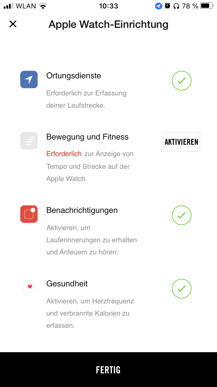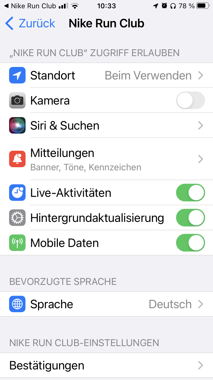 Bitte gewähre Nike Run Club Zugriff auf Bewegungs- und Fitnessdaten über Dein iPhone. Gehe zu den Einstellungen und anschließend zu Nike Run Club. Aktiviere Bewegung und Fitness.
