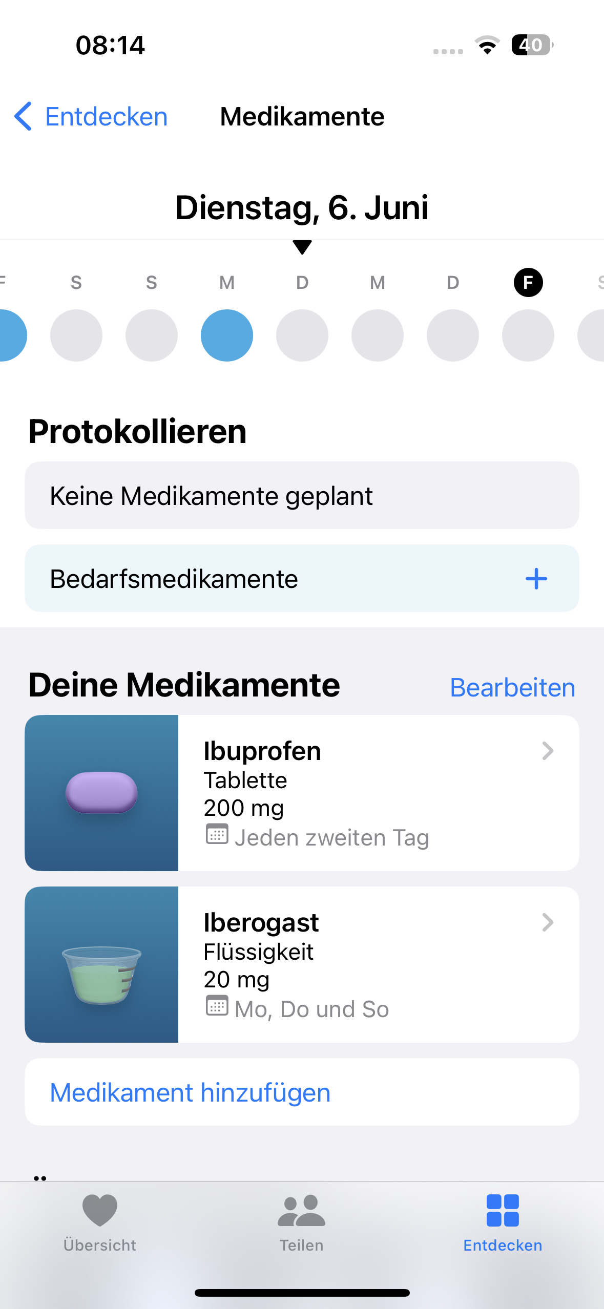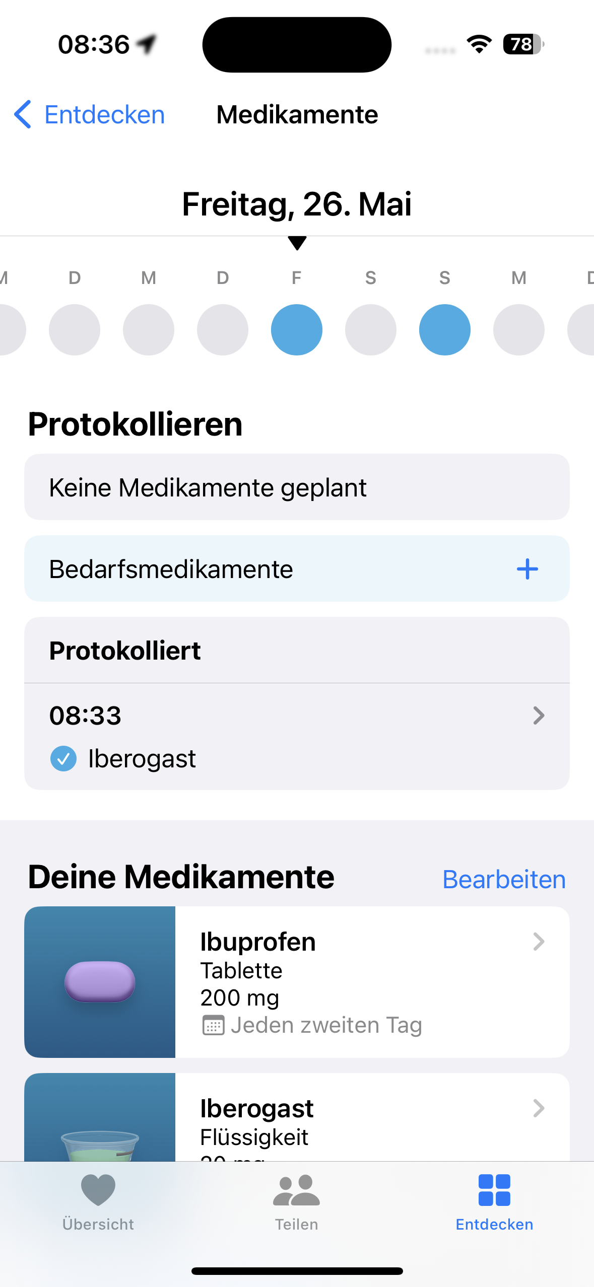 Wenn du das Medikament dann hinzugefügt hast, kannst du oben in der Tagesansicht mit den Kreisen(im Bild unten zu sehen) in der Vergangenheit zurückgehen auf das gewünschte Datum und dann auf "Bedarfsmedikamente +" gehen. Dort wählst du dann bei dem betreffenden Medikament "Eingenommen" aus und gehst dann auf "Fertig". Danach wird dir der Kreis in Farbe(bei mir blau) angezeigt, was dafür steht, dass du an dem Tag ein Medikament eingenommen hast und unter "Protokolliert" steht das betreffende Medikament.