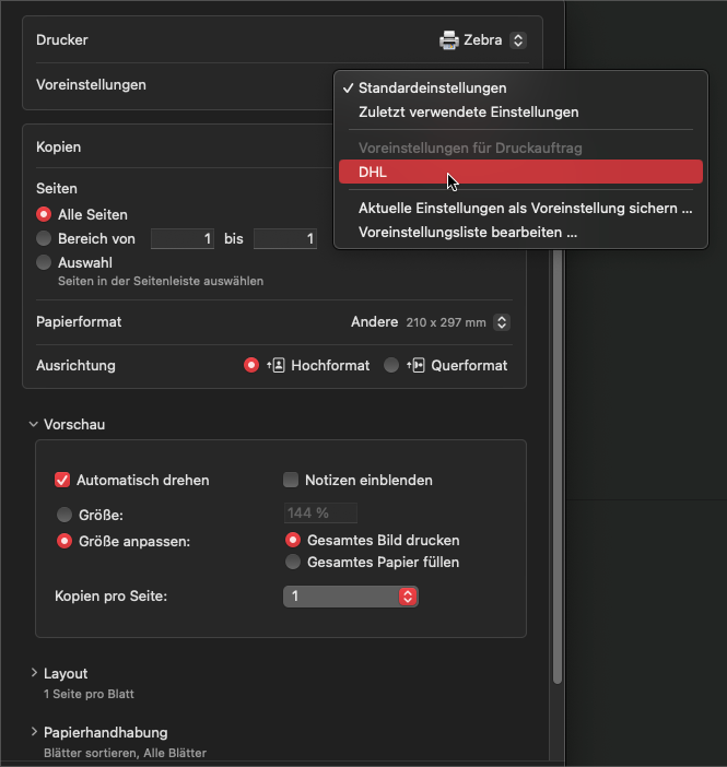 Wie kann ich die angepassten Voreinstellungen (in meinem Fall DHL mit dem Custom Papierformat 104x199mm) als Standardeinstellungen setzen, sodass ich sie nicht bei jedem Druck neu auswählen muss?