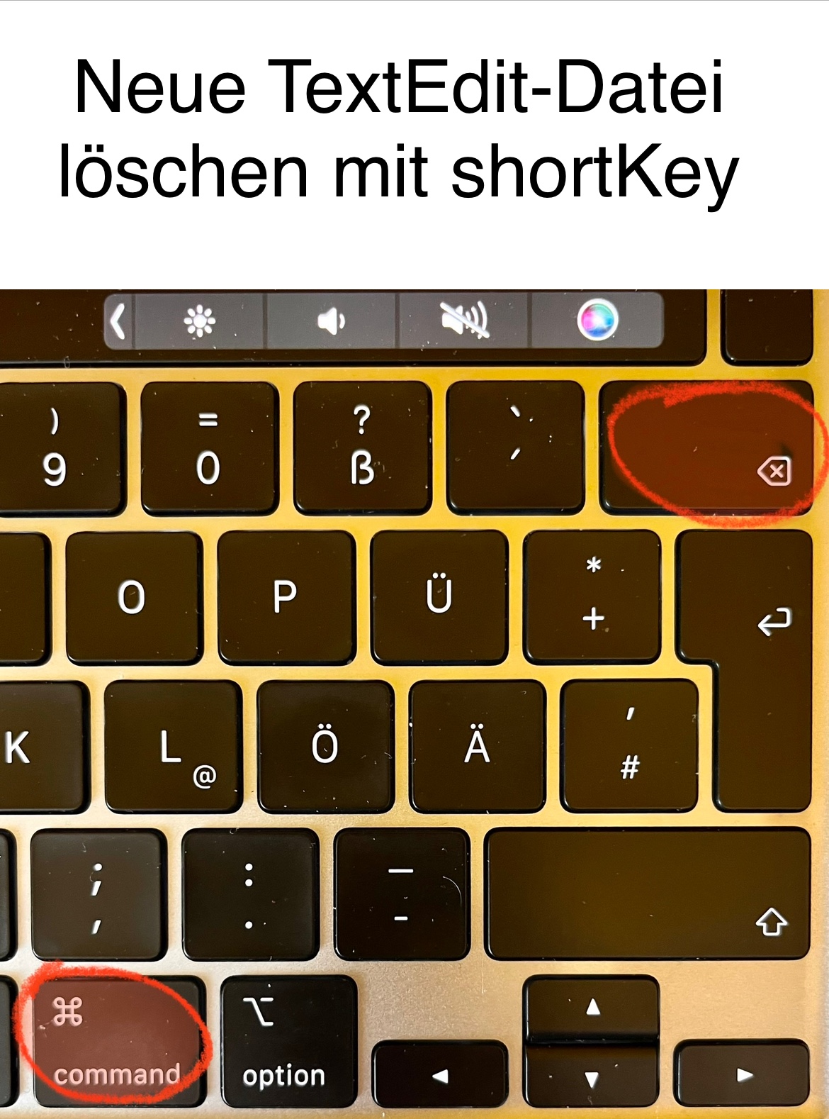 Ich kann alles mit Shortkeys steuern (in Textedit) außer ich möchte neuen einen Text doch nicht speichern. bbei command + W kann ich dann Löschen (in roter Schrift) drücken, aber ich finde keine Tastenkombination dafür. Vielleicht kennt ja jemand diesen Shortkey …