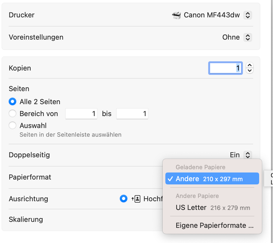 Wenn ich nun jedoch (egal welche APP) das Druckmenü über cmd+p öffne, steht unter Format immer "andere" mit dem korrekten A4 Format.
