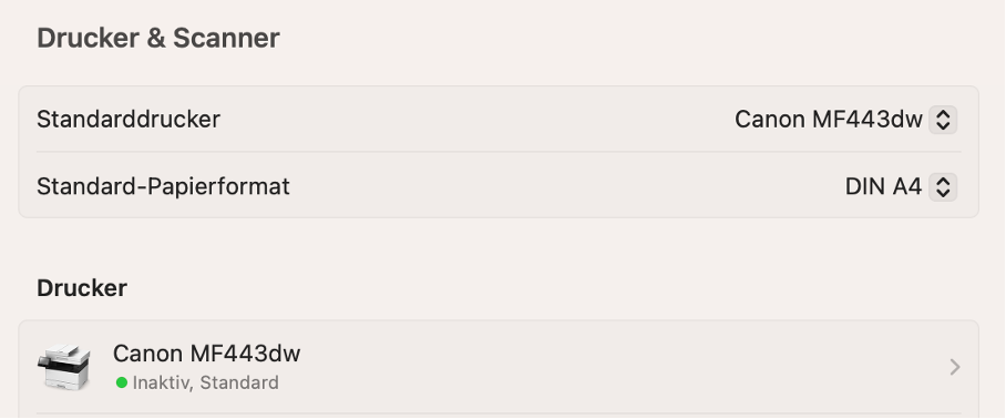 Ich habe seit rund 2 Jahren einen Canon MF443dw Drucker der über AirPrint angeschlossen ist. Ich habe vor einigen Wochen MacOS Ventura 13.4 neu installiert und seither ein seltsames Problem:
