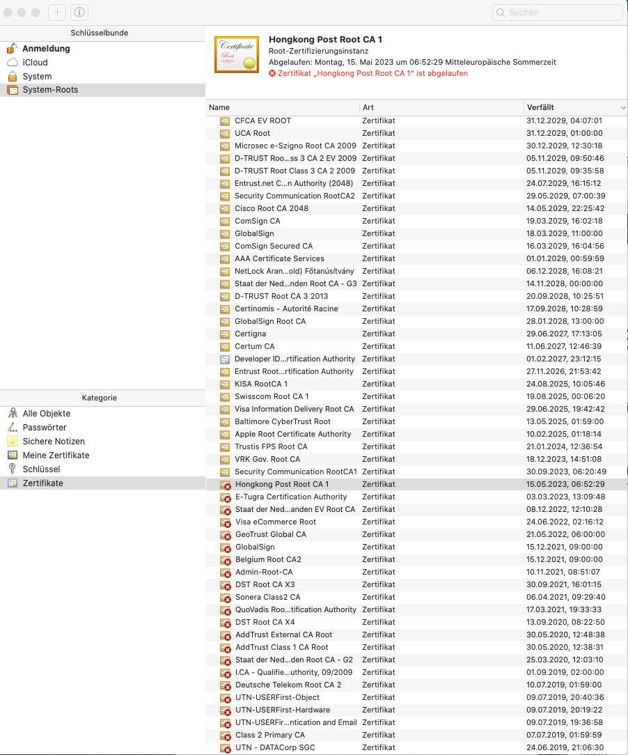 Es ist grundsätzlich besser, abgelaufene Zertifikate im Schlüsselbund zu belassen, weil auch immer ein paar fragwürdige darunter sein können. Diese werden - wenn gelöscht - sonst unter Umständen aktualisiert nachinstalliert.