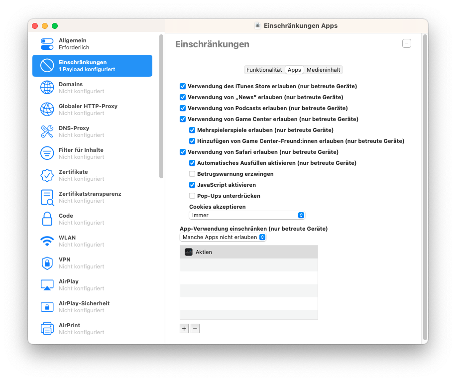 wir haben das MDM von Sophos Mobile im Einsatz und bei der Aufnahme von Geräten ins MDM werden Standard-Apps installiert wie Freeform, Bücher, Photo Booth, Podcasts usw.. installiert. Wie kann ich es verhindern, diese Apps installiert zu werden? Ich wollte das über das MDM automatisieren mithilfe eines Auftragspaket, allerdings hat das nicht geklappt, weil diese keine verwaltete Apps sind. Das konnte ich auch nicht erledigen, weil die Apps im "Apple Business manager" nicht zu sehen sind, die Suche nach der ID oder nach dem Link war auch erfolglos.