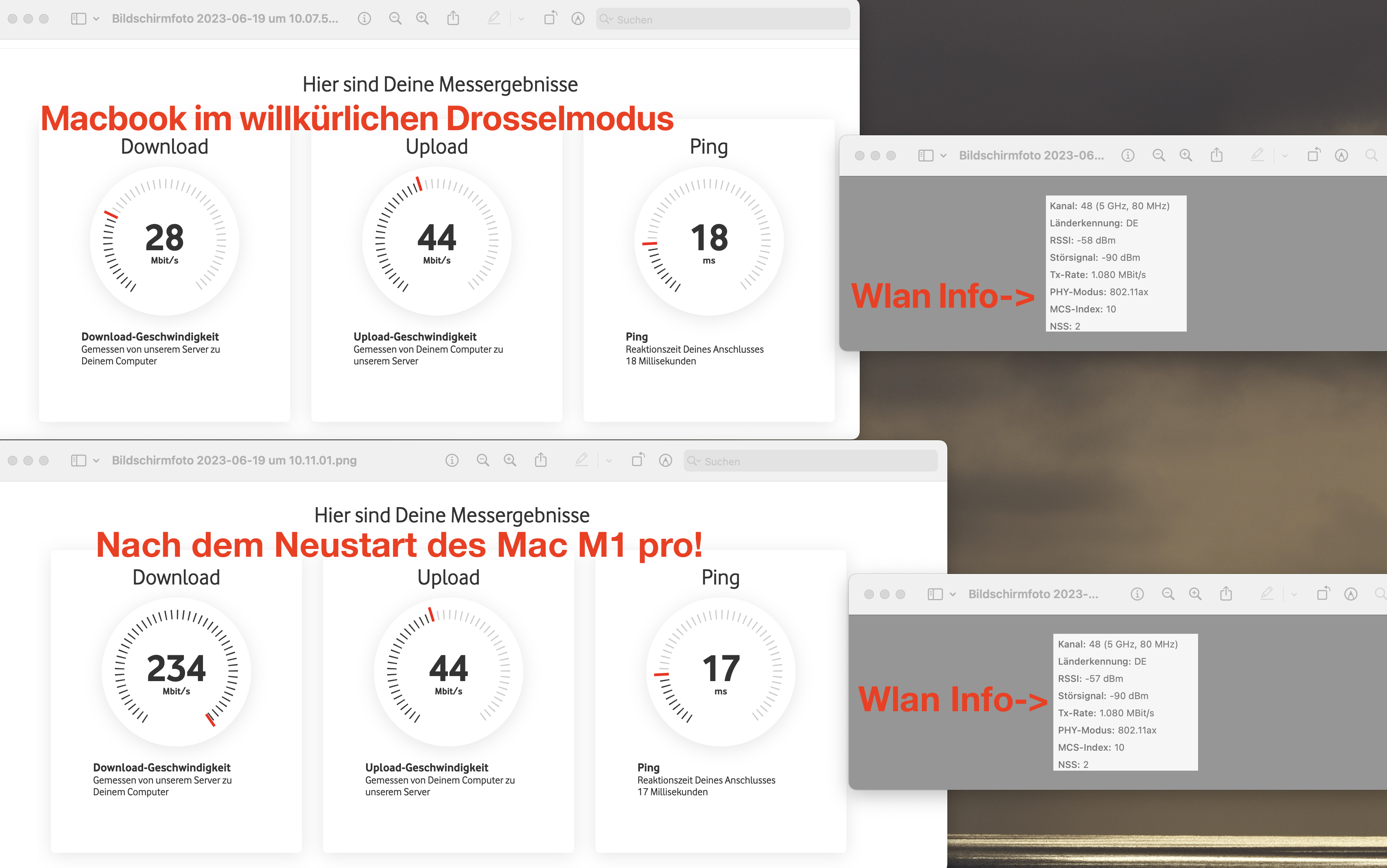 Macs drosseln plötzlich und willkürlich bei 30mbit im WLAN (M1, M2) Aktuelle Abhilfe: Neustart oder WLAN an/aus.