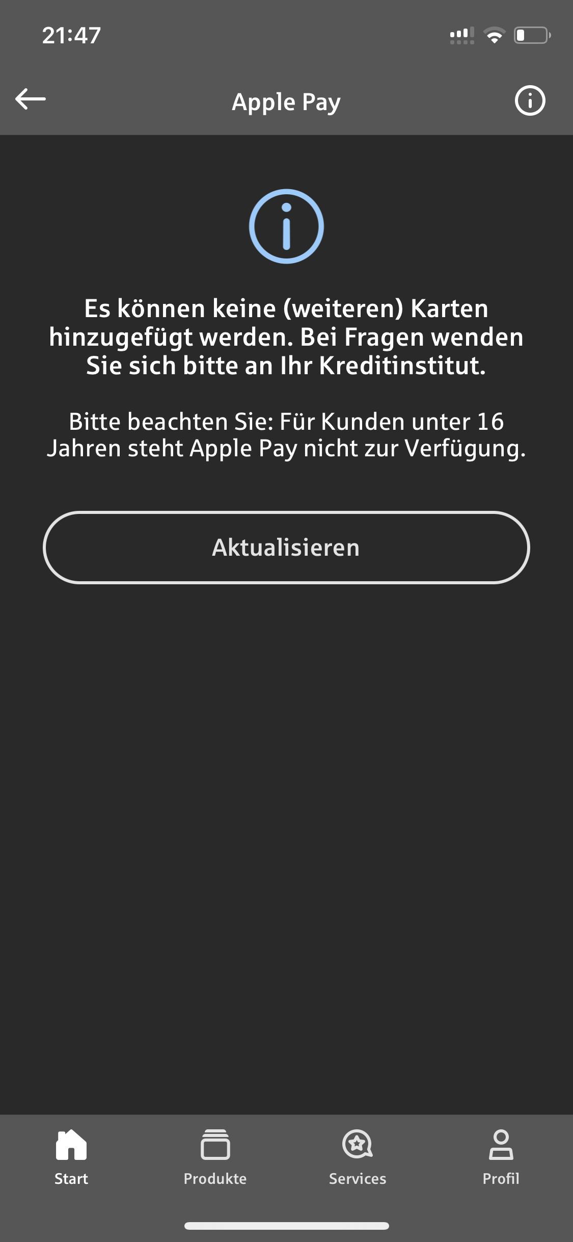 Ich habe eine Frage. Ich bin 16 Jahre alt und ich würde gerne Apple Pay haben, aber es wird mir immer angezeigt, das dies nicht funktioniert da ich nicht 16 bin. Ich habe ein Sparkassen Karte.