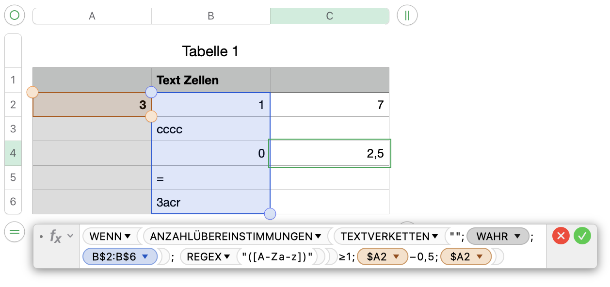 Formel C2=ANZAHLÜBEREINSTIMMUNGEN(TEXTVERKETTEN("";1;B$2:B$6); REGEX("([A-Za-z])"))