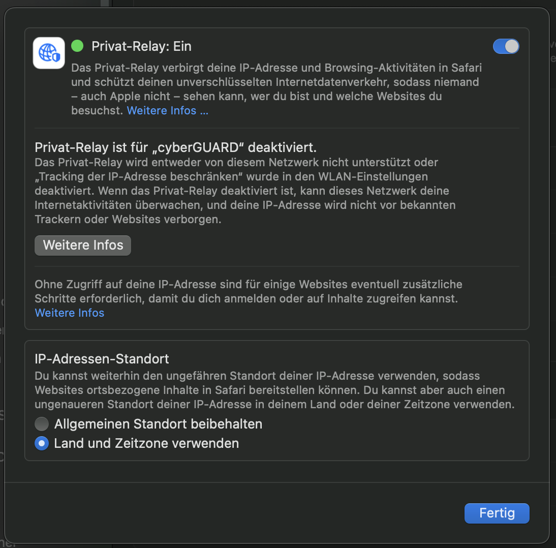 mitten in der Arbeit hat sich heute mein Private-Relay verabschiedet mit der Fehlermeldung, daß mein WLAN Netzwerk nicht länger Private-Relay unterstützt, ohne daß ich irgend eine Änderung vorgenommen hätte ... ?