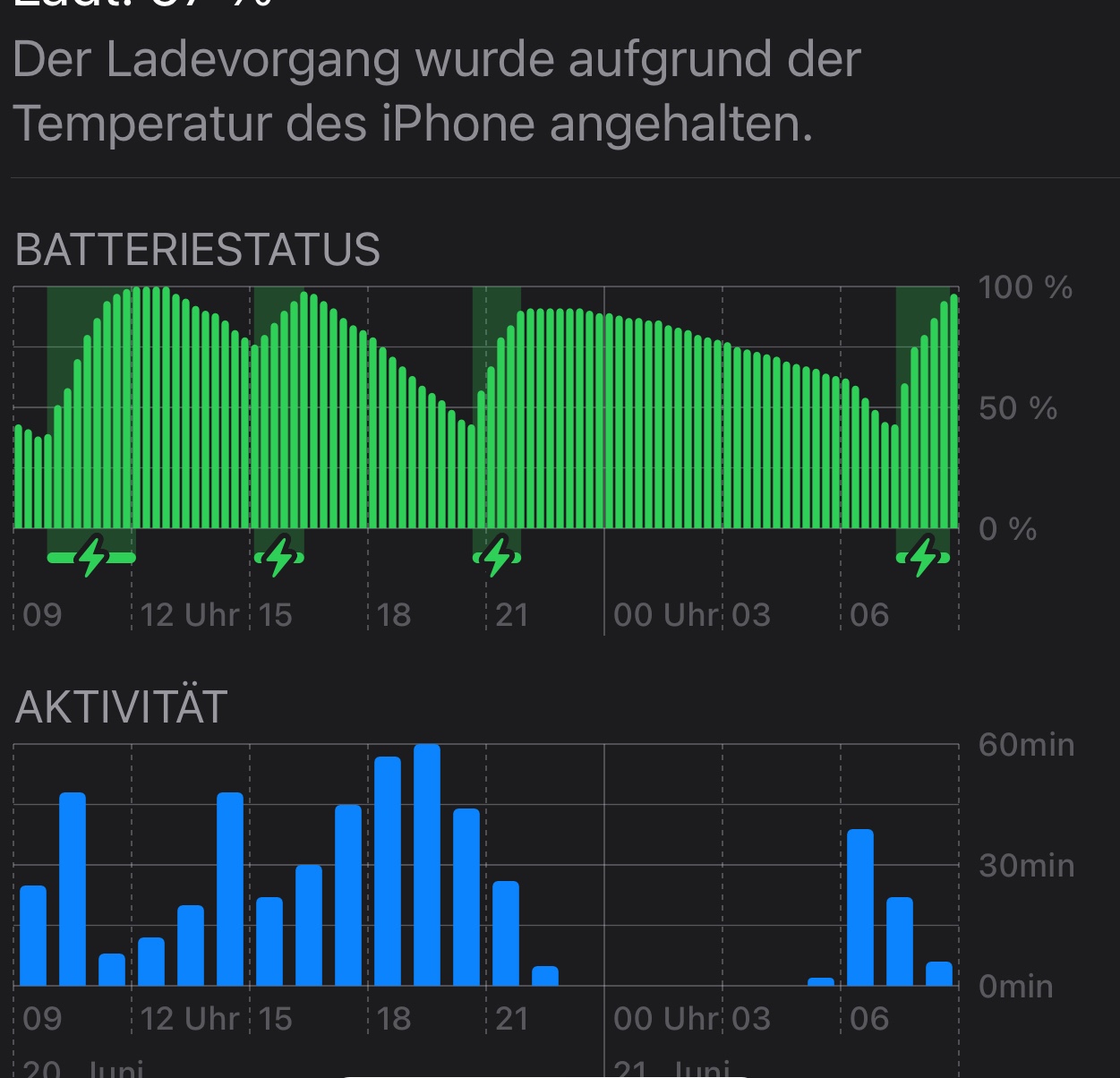 Und ja das Gerät lag jetzt 30 Minuten ohne Nutzung an der Ladung und diese wurde wegen der Temperatur angehalten.