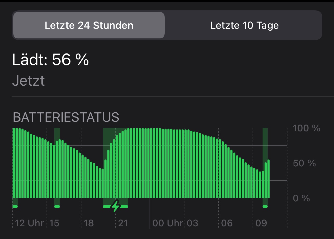 Ich lade das Gerät immer abends auf, so dass ich mit 100% Akku schlafen gehe. Ich möchte es nicht über Nacht laden, weil ich nicht weiss, ob dies trotz intelligentem Laden gut für den Akku ist (kann da jemand Erfahrungen geben?). Ich aktiviere abends immer den Fokus "Schlafen" der so eingestellt ist, dass nix ankommt. Auch der Stromparmodus ist in diesem Fokus aktiviert. Früher war es so, daas morgens beim Aufstehen höchstens 2% Akku weg waren. Mittlerweile wache ich um 5.30 Uhr auf und habe nur noch 80 bis 84% Akku.
