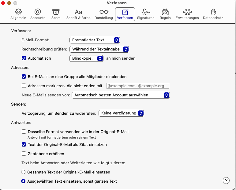 Apple Mail hängt bei Mail-Antwort an den Absender dessen alte Anhänge obwohl ich das nicht will immer mit an. Ist das wieder ein Bug oder eine neue Unzulänglichkeit von APPLE-Mail? Ich abe hier meine APPLE-Mail-Einstellungen / Verfassen abgebildet: