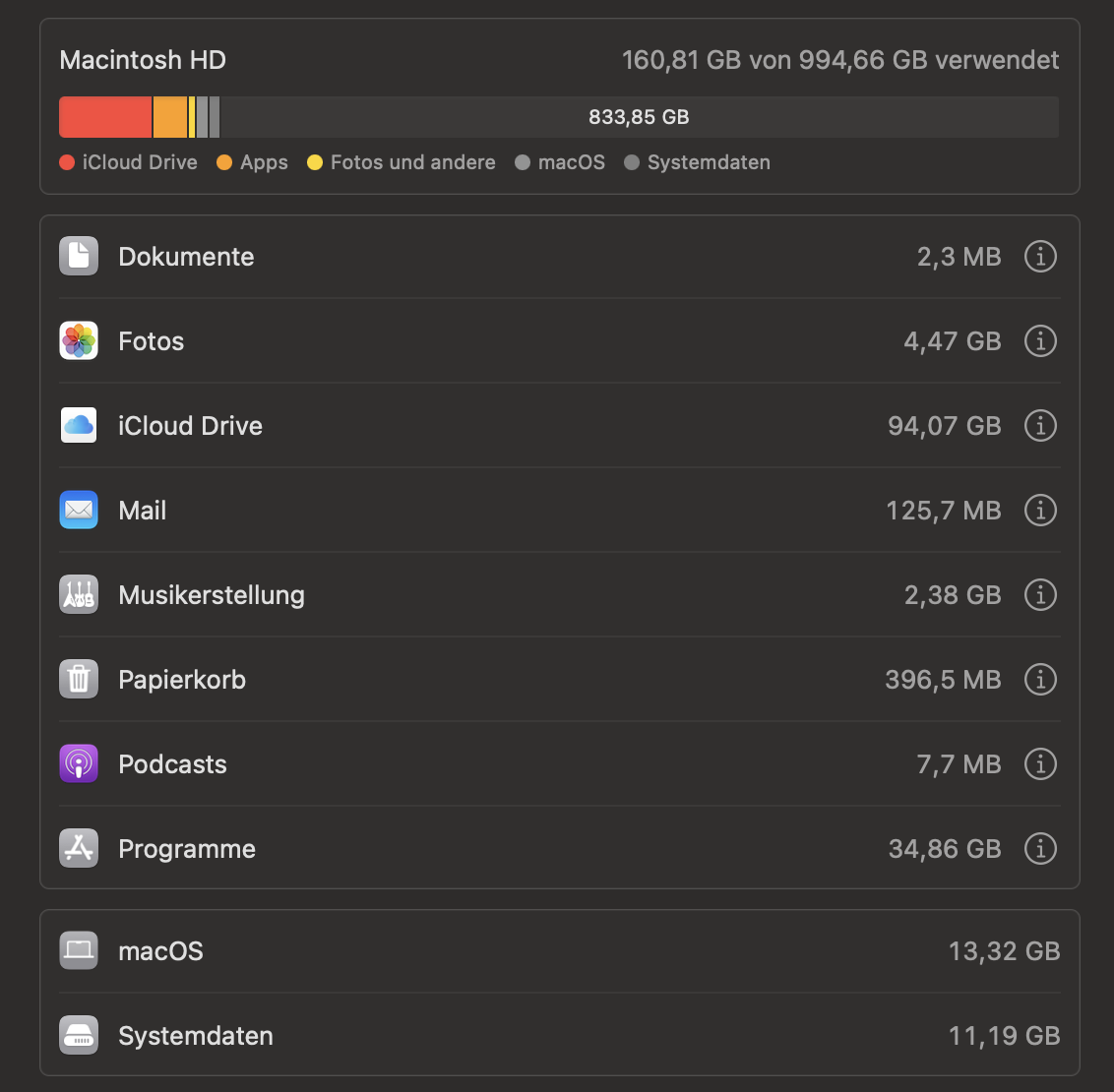 Dein Mac kann dir anzeigen, wie viel Speicherplatz von verschiedenen Dateikategorien belegt wird, und wie viel Platz für zusätzliche Dateien zur Verfügung steht. Während du die Schritte in diesem Artikel ausführst, um Speicherplatz freizugeben, werden diese Speicherinformationen automatisch aktualisiert.