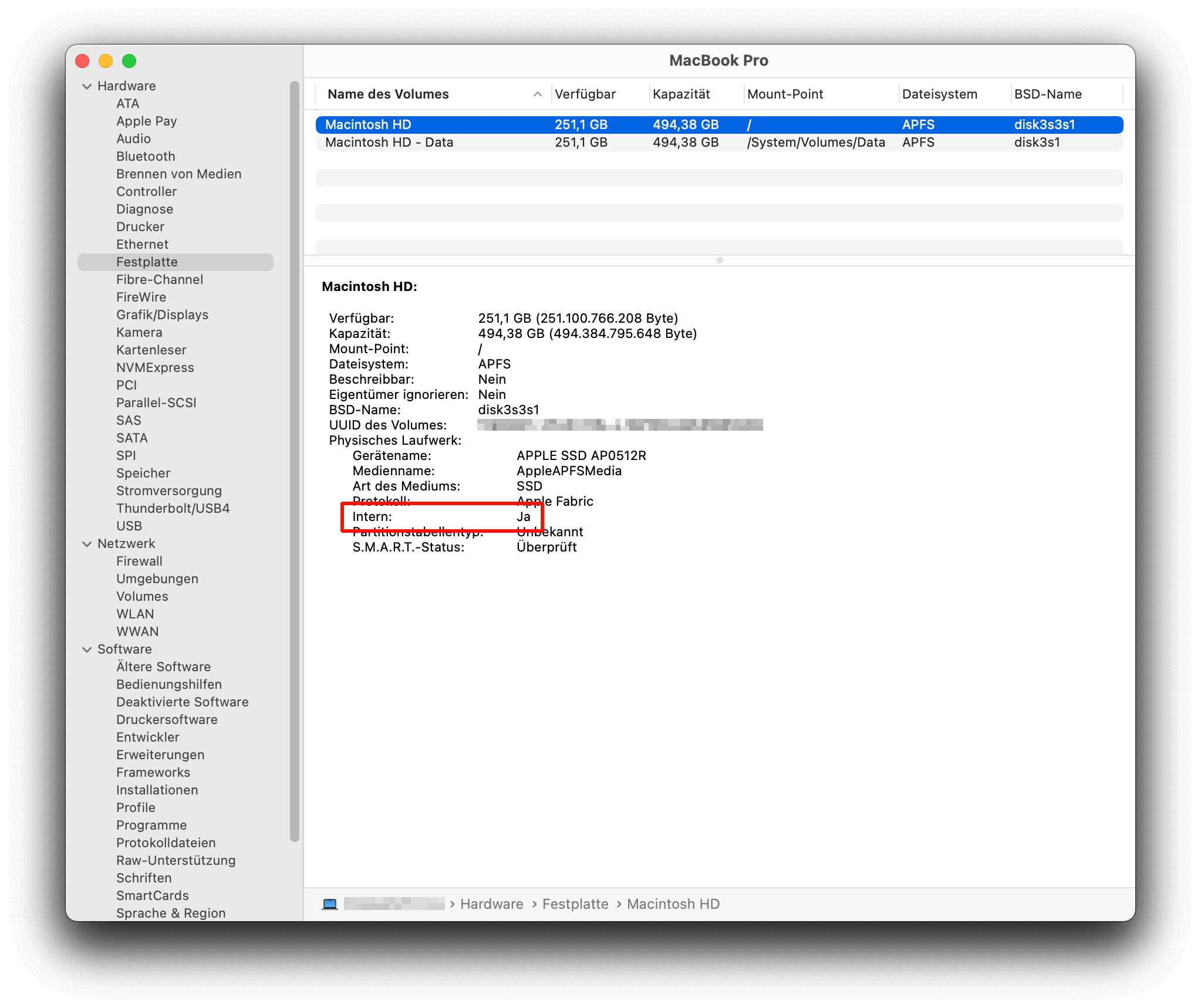 so ganz kann ich dir nicht folgen... die interne Festplatte wird von macOS als externe Festplatte gesehen? Wie kommst du zu dieser Aussage?!