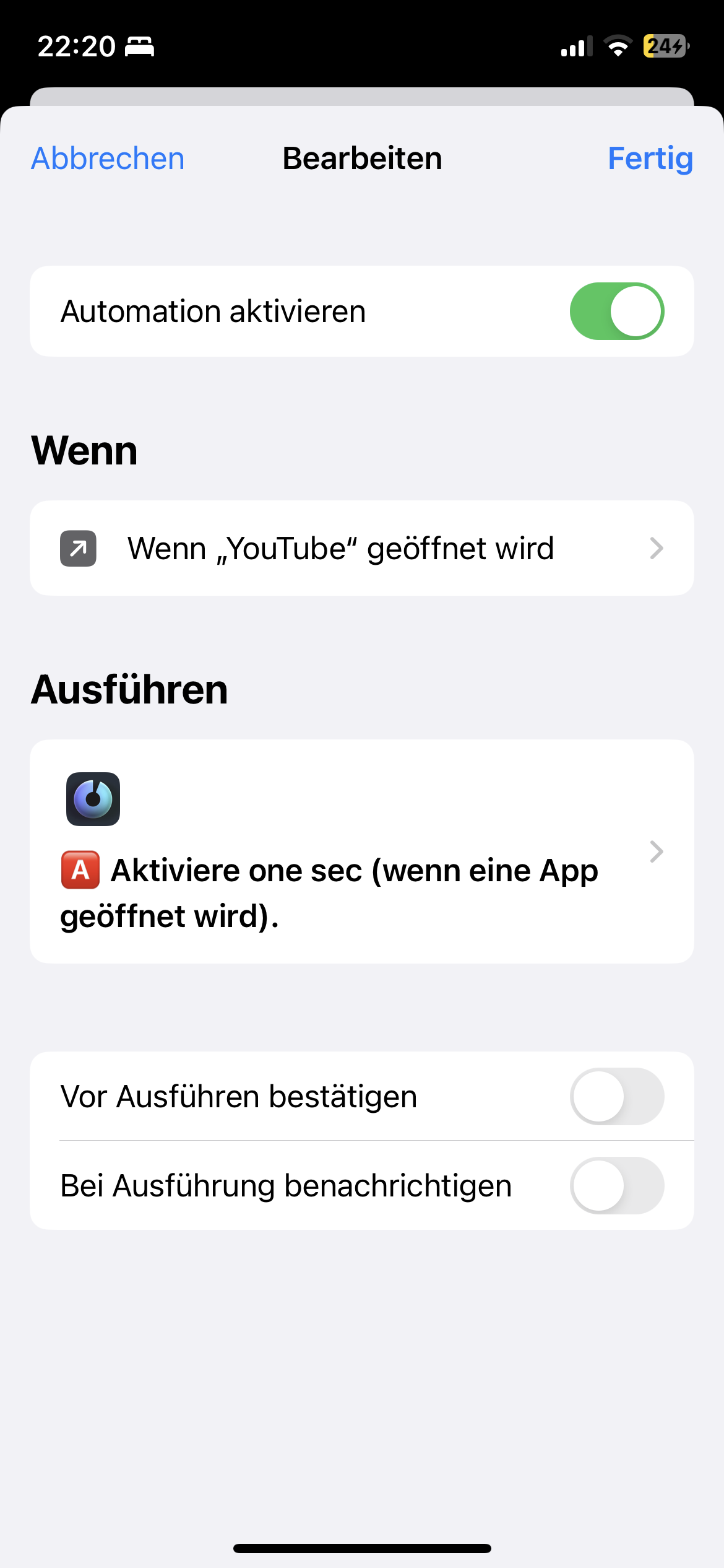 ich hab ein Problem mit einem kurz Befehl. Ich hab mal eine kurz Befehl erstellt um von App YouTube schnell ins App Onesec zu wechseln. Das hat in den ersten tagen sehr gut geklappt, aber dann hat meinen Bruder mit der Einstellungen meines Handys gespielt. Jetzt funktioniert diese Kutzbefehl nicht mehr und die Apps werden nicht automatisch gewechselt. Ich habe versucht den Kurzbefehl zu löschen und wieder zu erstellen in der Hoffnung dass es klappen würde, aber es funktioniert trotzdem nicht irgendwie wird dieses Kurzbefehl blockiert. Hat jemand von euch eine Ahnung was ich dagegen machen könnte?