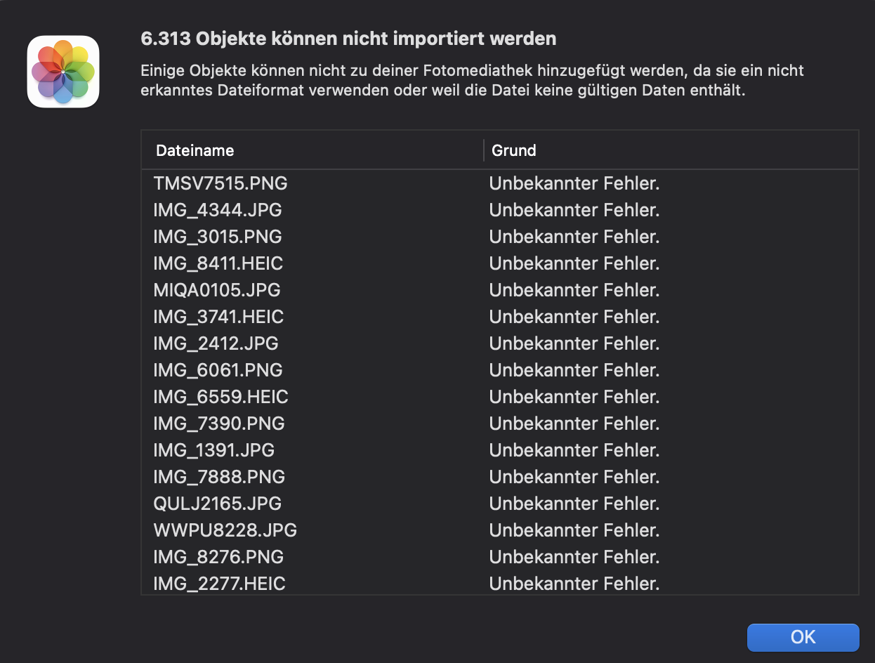 Bilder schlagen beim Laden in die Fotos App fehl