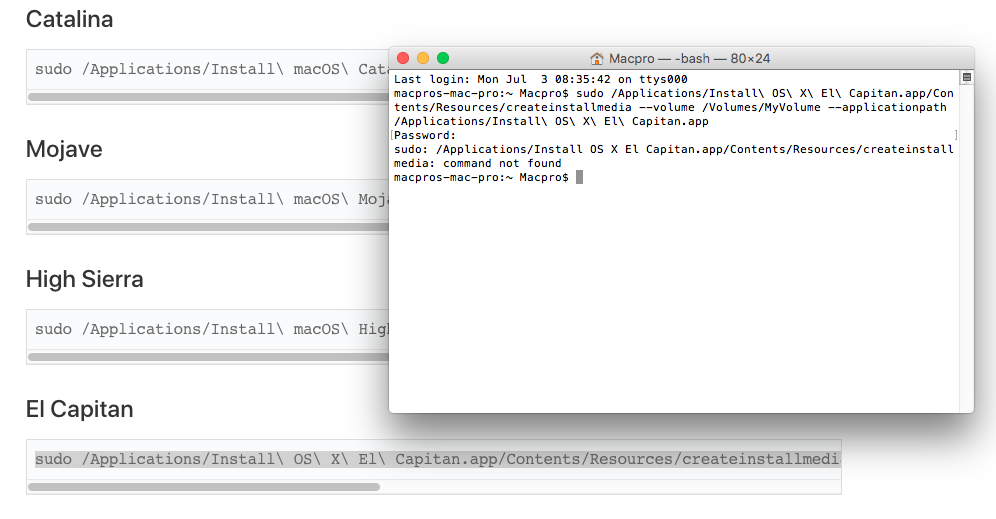 Ich habe den Befehl jetzt von dieser Seite Startfähiges Installationsprogramm für macOS erstellen herunterkopiert: