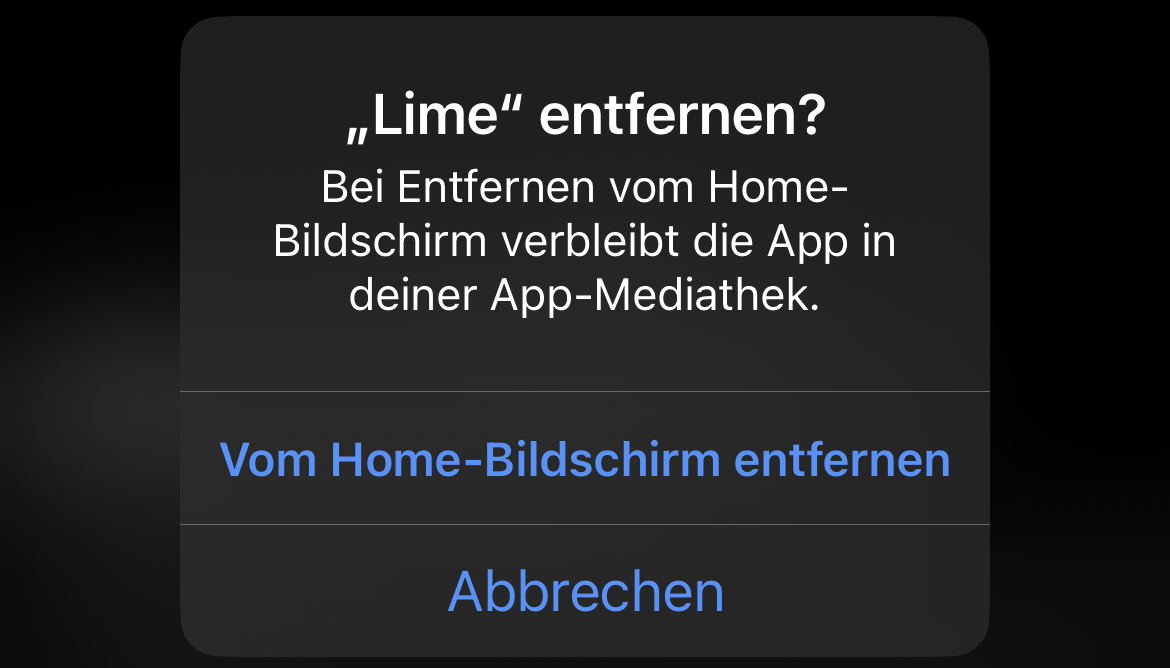 Versuche ich die "normale methode", also länger auf dem app icon bleiben und dann auf app entfernen, gibt es nur die möglichkeit die app vom homebildschrim zu entfernen