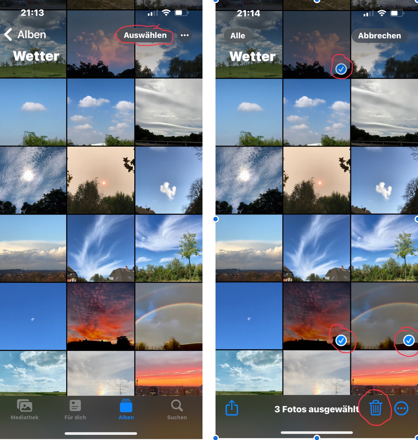 Wie du auf den rechten Bild siehst, sind die ausgewählten Bilder mit einem Haken markiert. Tippst du unten auf den Papierkorb, werden diese Fotos nach der Bestätigung in den Ordner „Zuletzt gelöscht“ verschoben. Diesen findest du, wenn du unten auf dem Display auf „Alben“ tippst und nach oben scrollst.