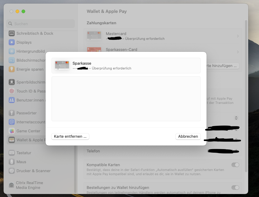 Hallo zusammen, ich wollte gerne meine neue Kreditkarte auf dem Mac im Wallet hinzufügen. Leider kann ich die Karte durch meine Bank nicht überprüfen lassen. Entweder bekomme ich den Hinweis, dass die Überprüfung gerade nicht funktioniert und ich es in ein paar Minuten erneut versuchen soll, oder ich habe nicht einmal die Möglichkeit den Anruf zu tätigen, weil das Feld leer ist.