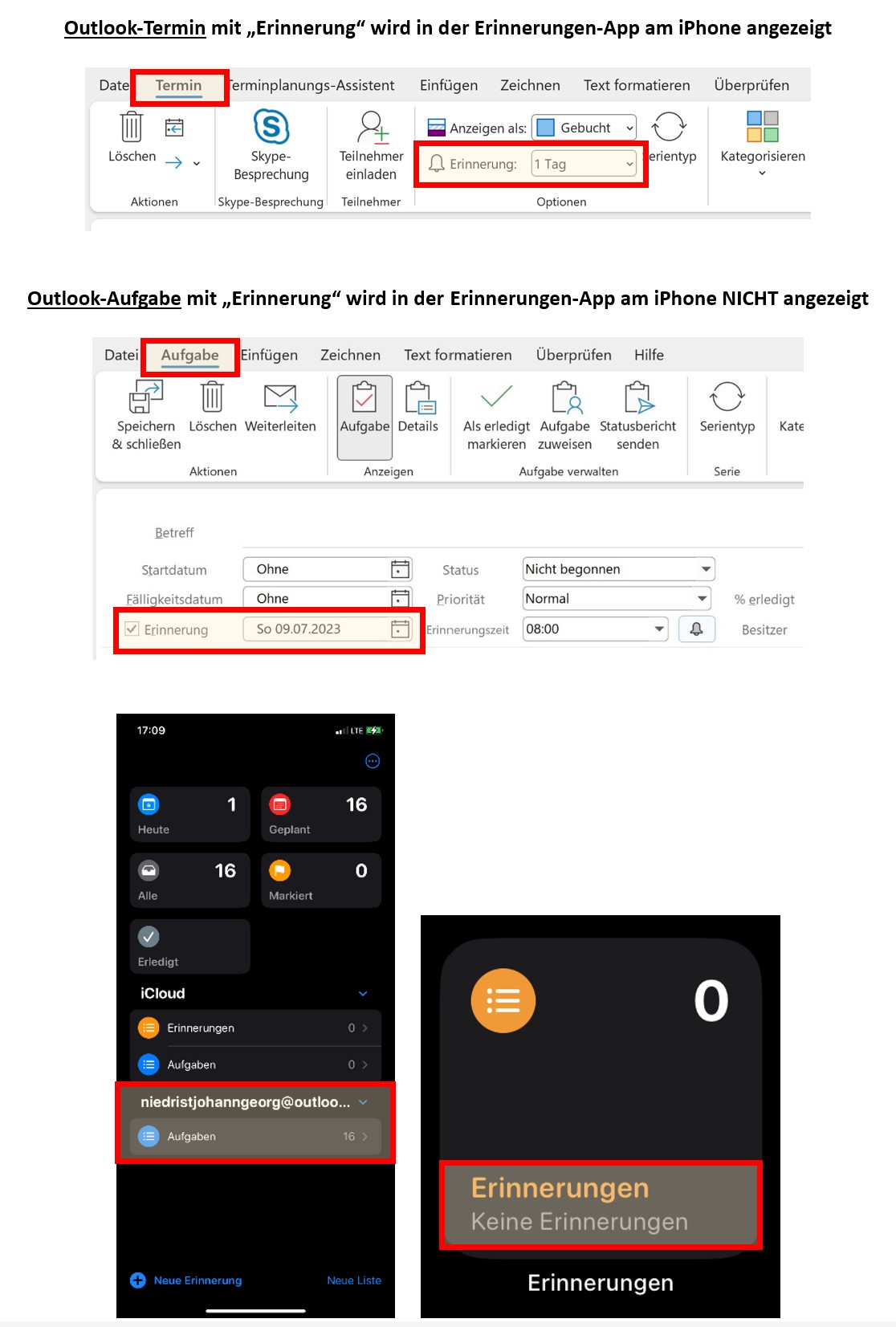 Und diese fehlende Anzeige der "Erinnerung" (die in Outlook zu einer "Aufgabe" erfasst wurde) verstehe ich nicht.