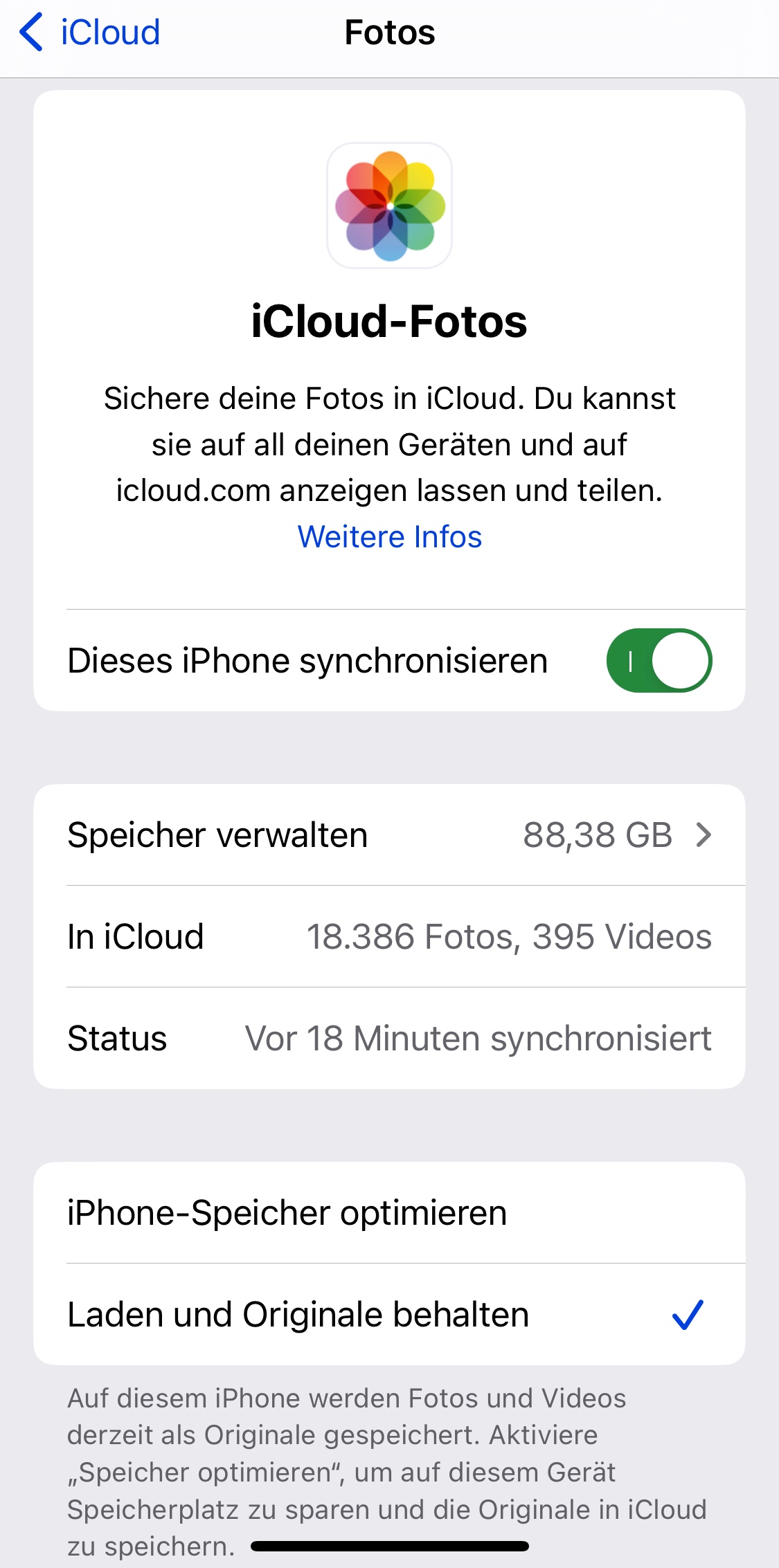 Beim Support wurde mir gesagt, dass bei meiner gewählten Einstellung in der Cloud nur eine Kopie der Bilder mit reduzierter Auflösung liegt. Das würde heißen, wenn ich mein iPhone verlieren würde, wären die Bilder in Originalauflösung weg. Und nur die reduzierte Auflösung aus der iCloud vorhanden.