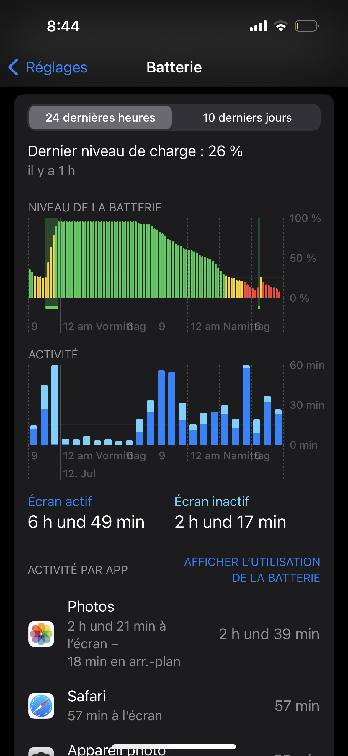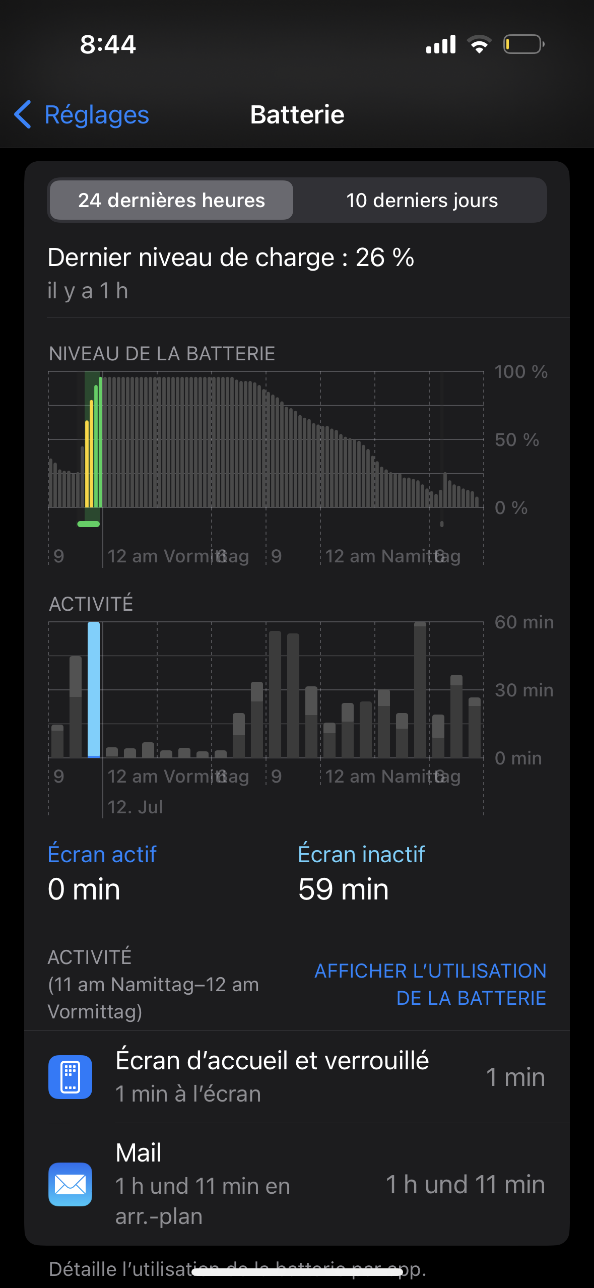 bei mir läuft ständig die Mail-App im Hintergrund und saugt den Akku leer, obwohl ich die Hintergrundaktualisierung für Mail ausgeschalten habe, Push ebenfalls aus ist und die Frequenz des Abfragens der Mails ebenfalls auf „Manuell“ ist. Das iPhone neu gestartet habe ich auch schon, einen Hard Reset habe ich auch schon durchgeführt. Kann mir hier jemand helfen? Ich hänge unten 2 Bilder an, die hellblauen Balken werden fast ausschliesslich von der Mail-App verursacht. (Lasst euch vom Französisch nicht stören, mein Handy ist zu Lernzwecken auf Französisch eingestellt…) Handy läuft mit iOS 16.5.1