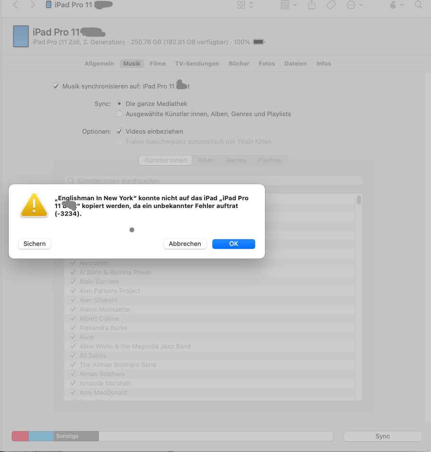 Neu auf dem Mac vorhandene Musik wird nicht auf iPhone oder iPad kopiert. Die Mediathek selbst schon, aber kein Inhalt dahinter. Es erscheint auch immer der Fehler 3234 für 4-5 Musikstücke. Es handelt sich aber um bisher synchronisierte und nicht die neuen.