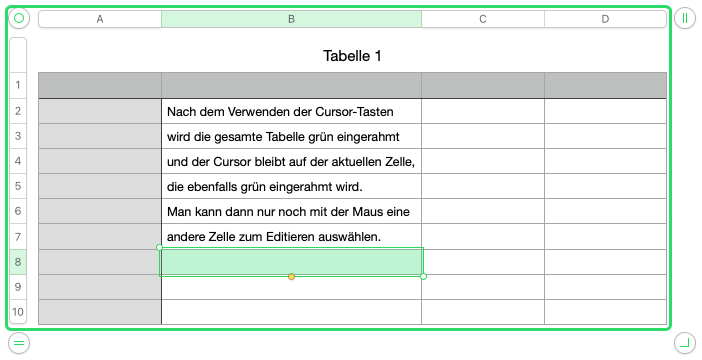 Warum erscheint in Numbers nach dem Verwenden der Cursor Tasten diese grüne Box rund um die aktuelle Seite zusammen mit der veränderten Eingabe? Wie kann man das ausschalten?