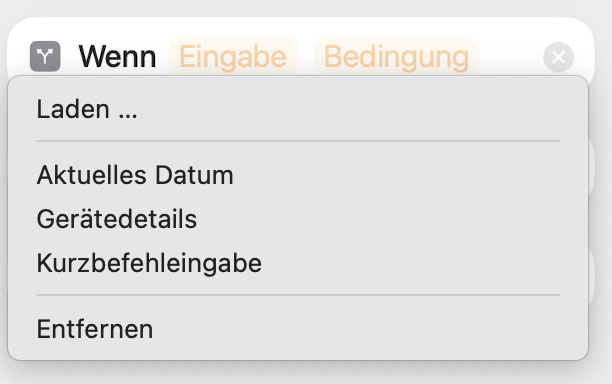Um einen Kurzbefehl einzugeben wähle ich die Option "Wenn" und klicke dann auf "Eingabe", es erscheint das abgebildete Menü und im obersten Feld sollte normalerweise kurz "Laden…" erscheinen und dann "Zubehör auswählen". (Das wären dann z.B. Sensoren oder Geräte in meinem Home-Netzwerk)