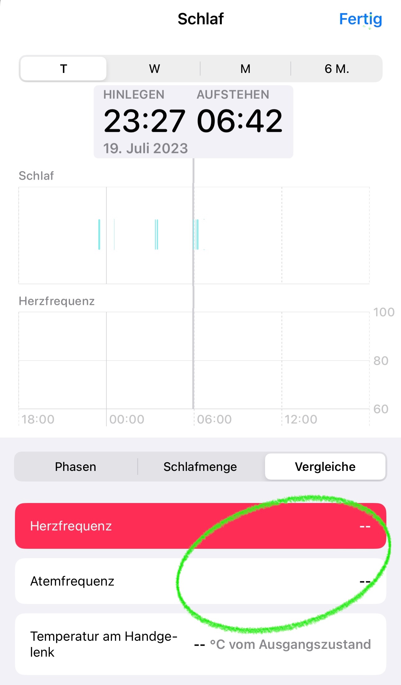 Hier, dass seit dem Zeitpunkt keine Schlafphasen sondern nur noch der Schlaf angezeigt wird. Und dieser auch nur zum Teil.