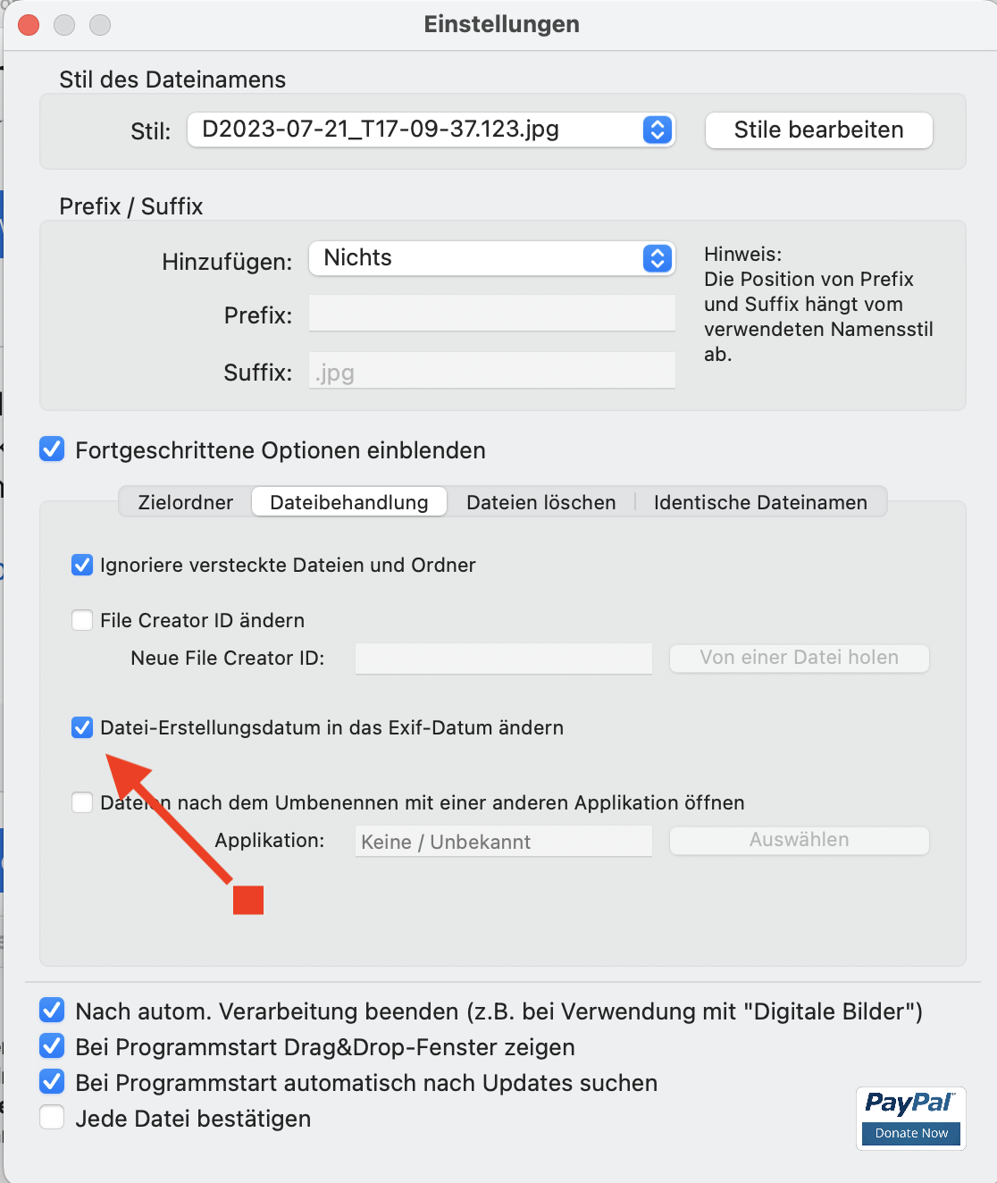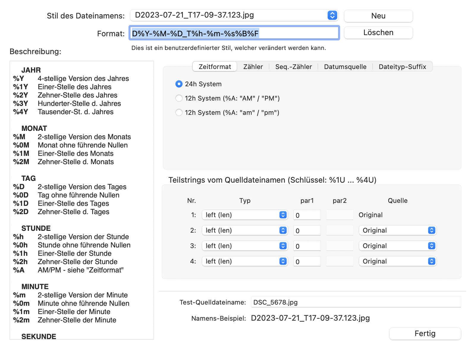 Der Dateiname kann Datum / Uhrzeit enthalten, diese Infos werden aus der Fotodatei ausgelesen.