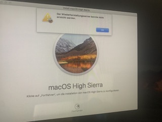Hallo, ich wollte meine Festplatte löschen um mehr Speicher zu haben, also habe ich meinen iMac ausgeschalten und beim anschalten die Befehlstaste und die R Taste gedrückt. So bin ich zu dem MacOS- Dienstprogramm gekommen. Ich bin also auf das Festplattendienstprogramm gegangen und habe die Festplatte gelöscht. Danach wollte ich das macOS neu installieren. Mit dem macOS High Sierra. Drücke ich jedoch auf Fortfahren kommt die Meldung „Der Wiederherstellungsserver konnte nicht erreicht werden“. Ich habe auch ausprobiert das Terminal zu verwenden, dass hat aber auch nicht funktioniert. Das Neustarten auch nicht. Eine Internetverbindung habe ich. Ich brauche Hilfe hier wieder heraus zu kommen und meinen iMac wieder normal zu nutzen. Kann man dagegen irgendetwas tun?
