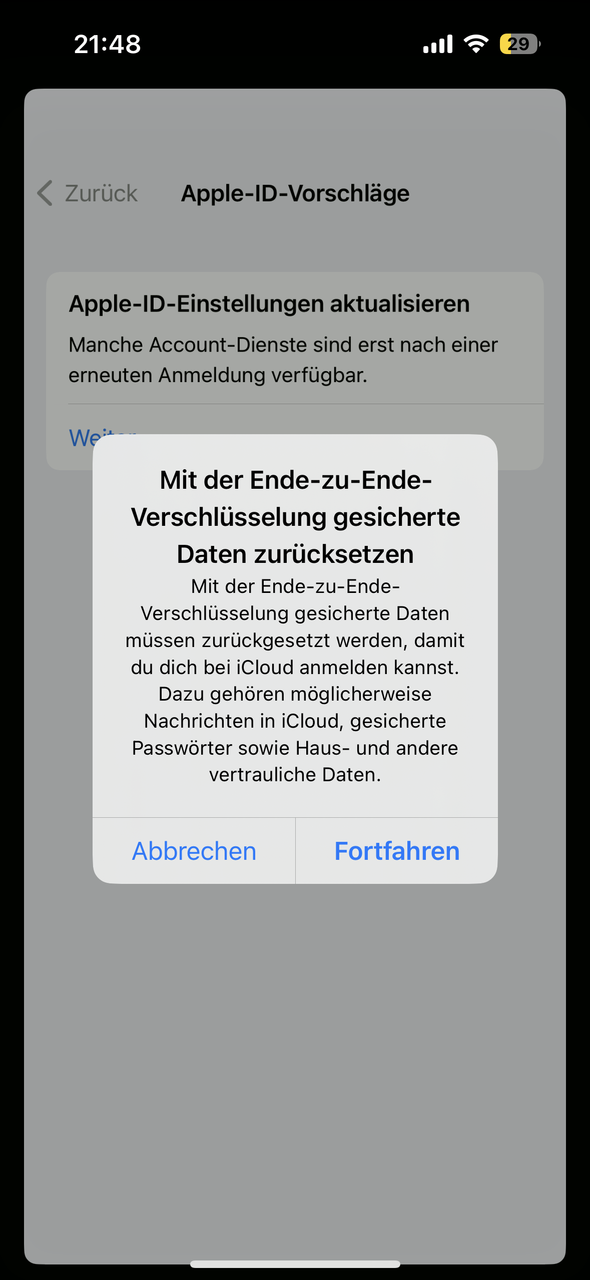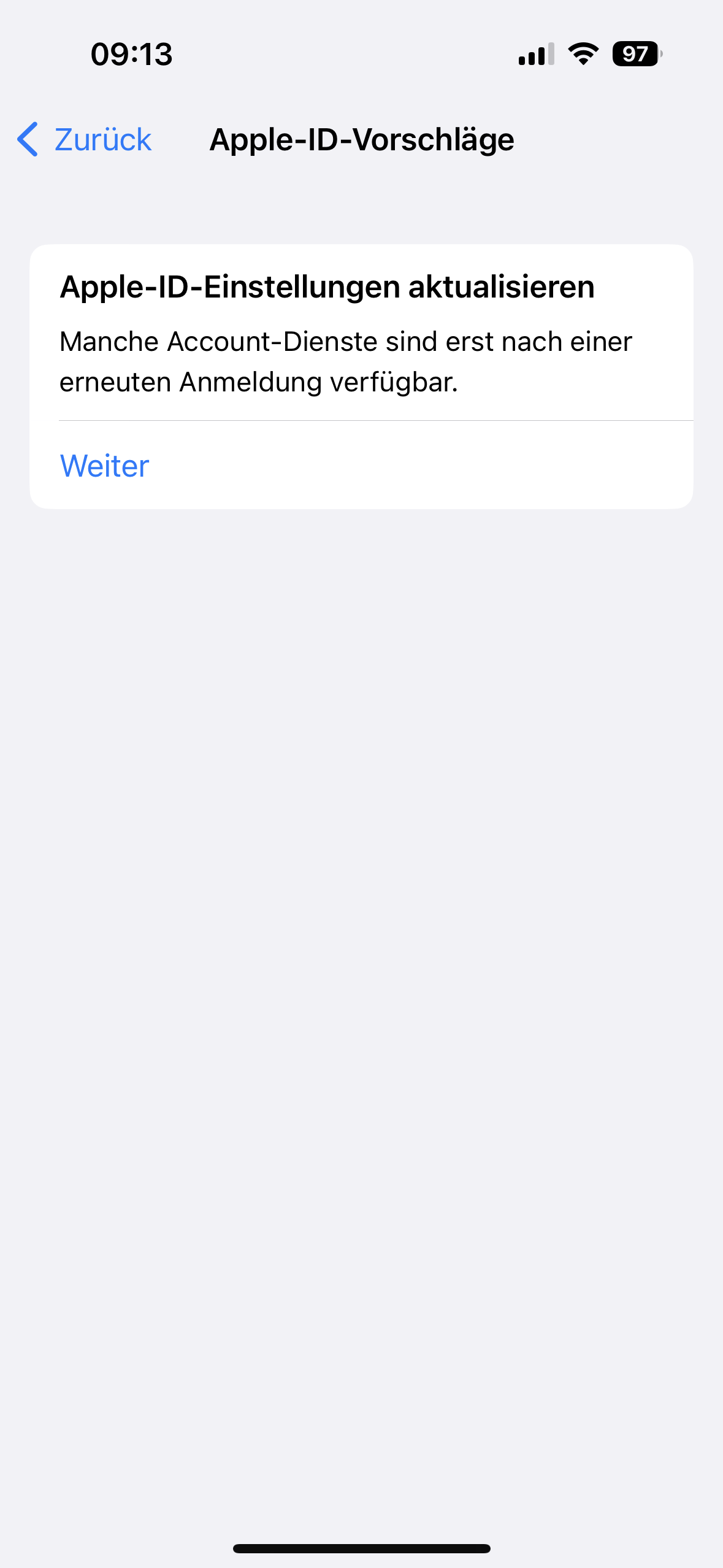 Seit Monaten habe ich die Benachrichtigung, dass die Apple-ID-Einstellungen aktualisiert werden müssen. Ich tippe rauf, gebe mein iCloud Passwort ein, nach kurzer Wartezeit wird mein iPhone Code erfragt nach Eingabe passiert erstmal nichts. Neuerdings kriege ich währenddessen folgenden Hinweis: