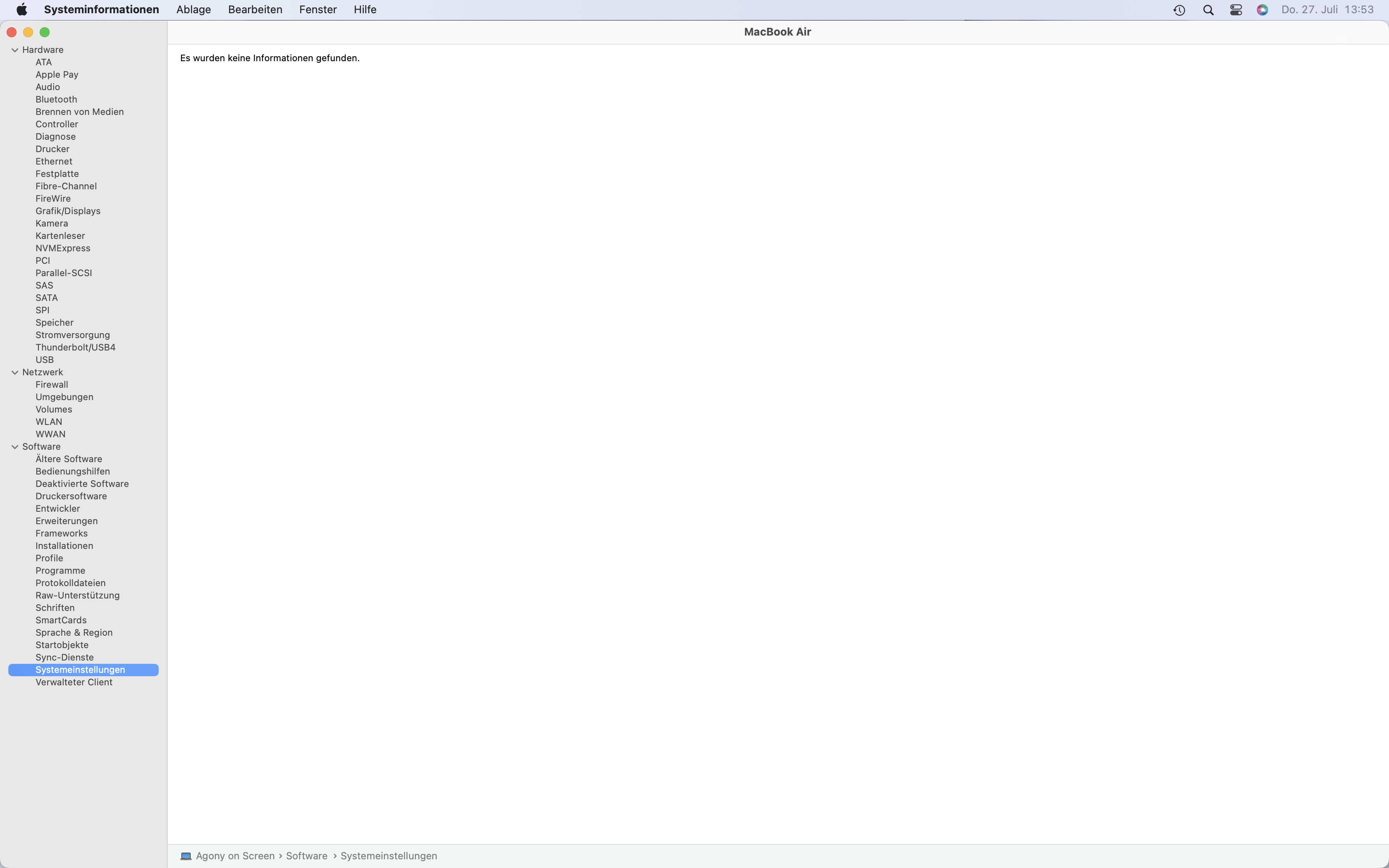 Nach dem Update auf 13.5 sind auf meinem MacBook Air M1 außer "Systemdienste" alle Apps aus der Liste in den Systemeinstellungen verschwunden. Mir ist auch aufgefallen dass im Systembericht unter Systemeinstellungen keine Einträge mehr vorhanden sind.