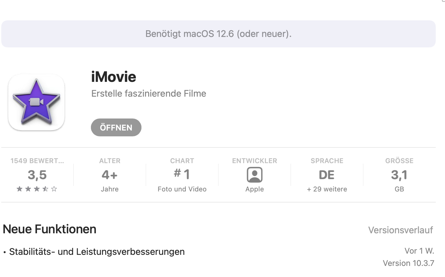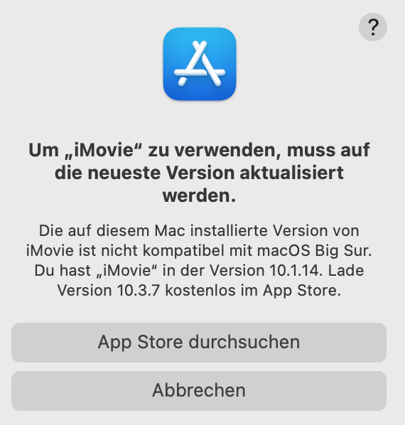 Hallo, nach dem Systemupdate meines iMac (Retina 5K, 27'', ultimo 2014) auf Big Sur 11.7.9 (letztes ladbares), kann iMouvie nicht mehr geöffnet werden, es wird ein update auf iMovie 10.3.7 verlangt das aber nur auf macOS 12.6 läuft. Gibt es eine ausführbare iMovie version im download? EineLösung? (Vram wurde zurückgesetzt und syst. neu installiert)