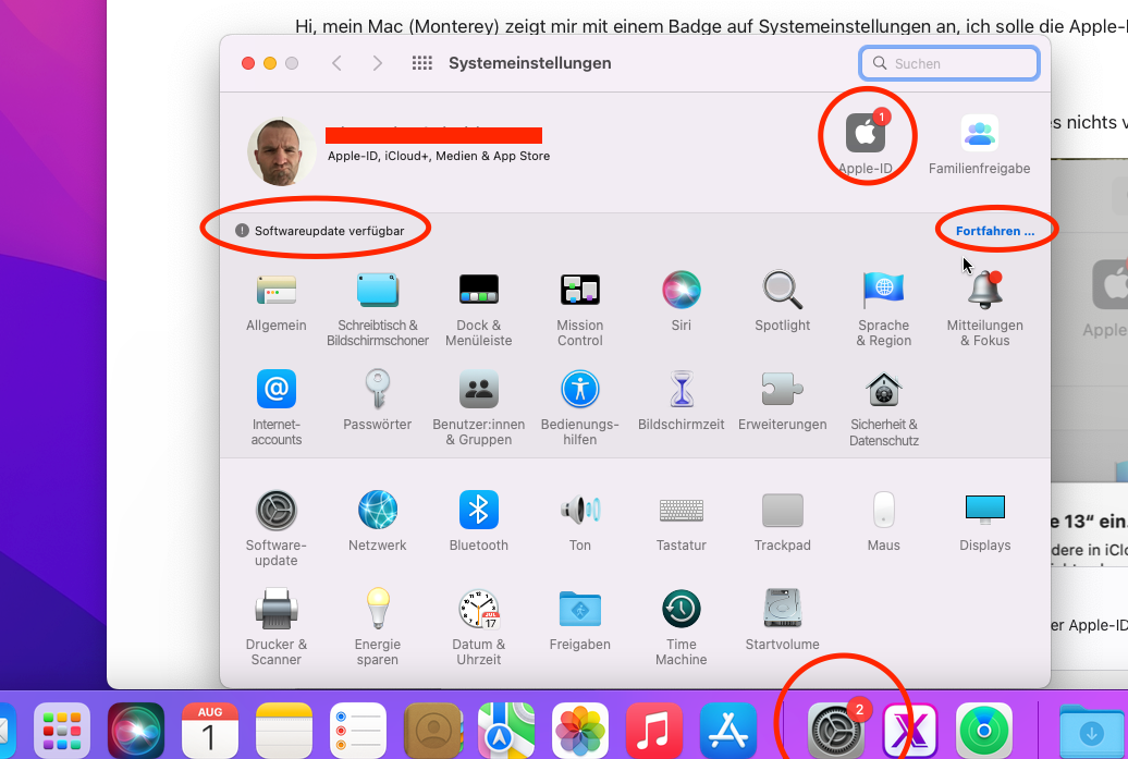 Insgesamt war es recht problemlos...nur nach dem Einspielen meiner Daten aus dem Time-Machine-Backup wird mir im Icon der "Systemeinstellungen" ein Badge mit einer 2 angezeigt. In den "Systemeinstellungen" selbst wird beim Icon für die Apple-ID ein Badge mit einer 1 angezeigt und über den Icons für die einzelnen Einstellungen steht links ein kleiner Text: "! Softwareupdate verfügbar" und rechts "Fortfahren..."