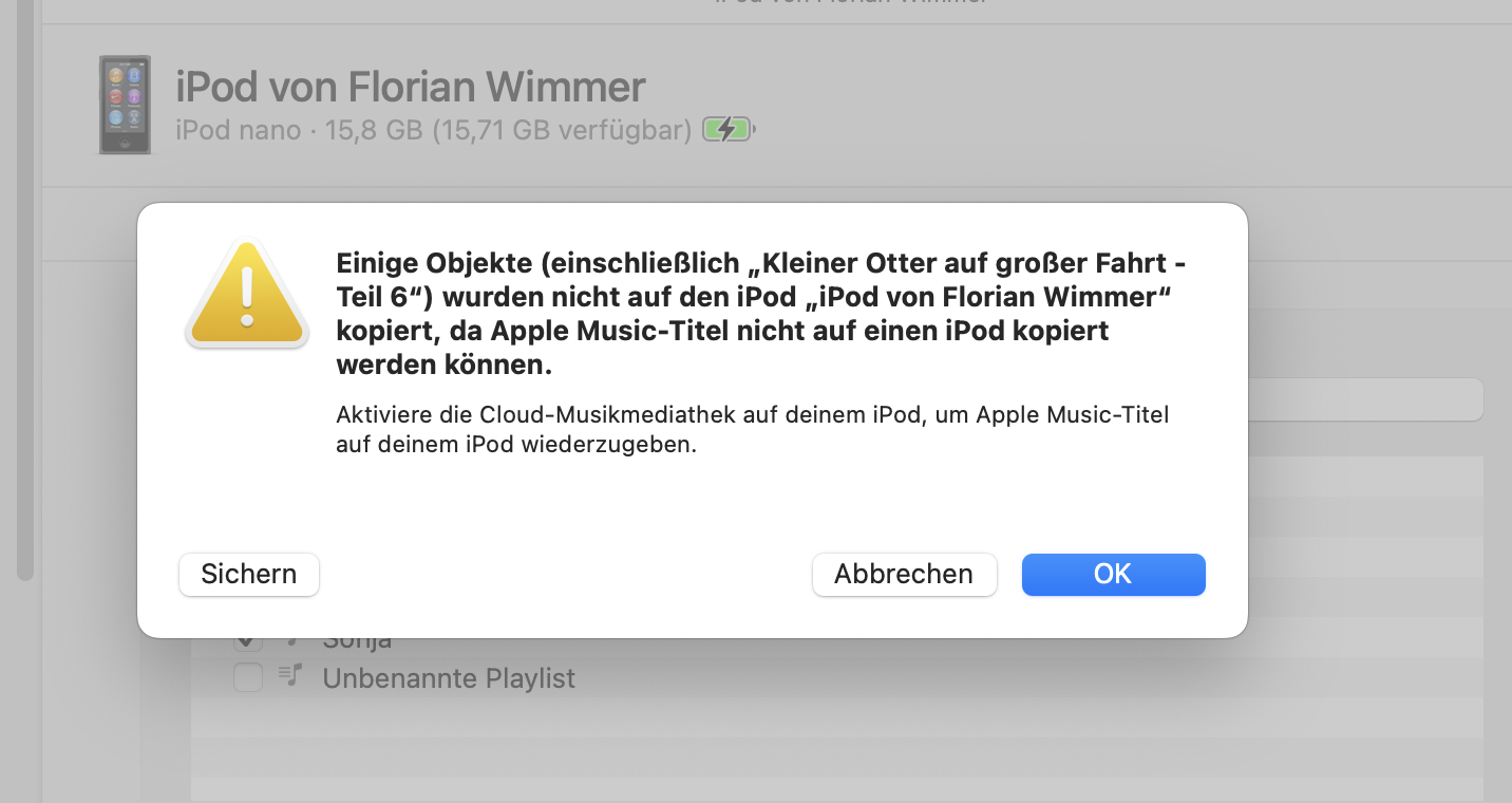 Hallo ich habe einen I pod Nano und wollte diesen mit neuer Music laden! Ich habe seit kurzem ein Mac Book und habe dies natürlich mit dem gemacht! Ich wollte den I pod löschen und mit neuen Liedern laden, als ich auf wiederherstellen gedrückt habe begann er mit der Aktion löschen und anschließend startete der Wiederherstellungsprozess doch plötzlich kommt die Meldung ( Gerät kann nicht gelesen werden ) auswerfen , Ignorieren , Installieren ) egal was ich anklicke es hängt sich immer Finder auf und die Installation wird nicht zu ende gebracht !